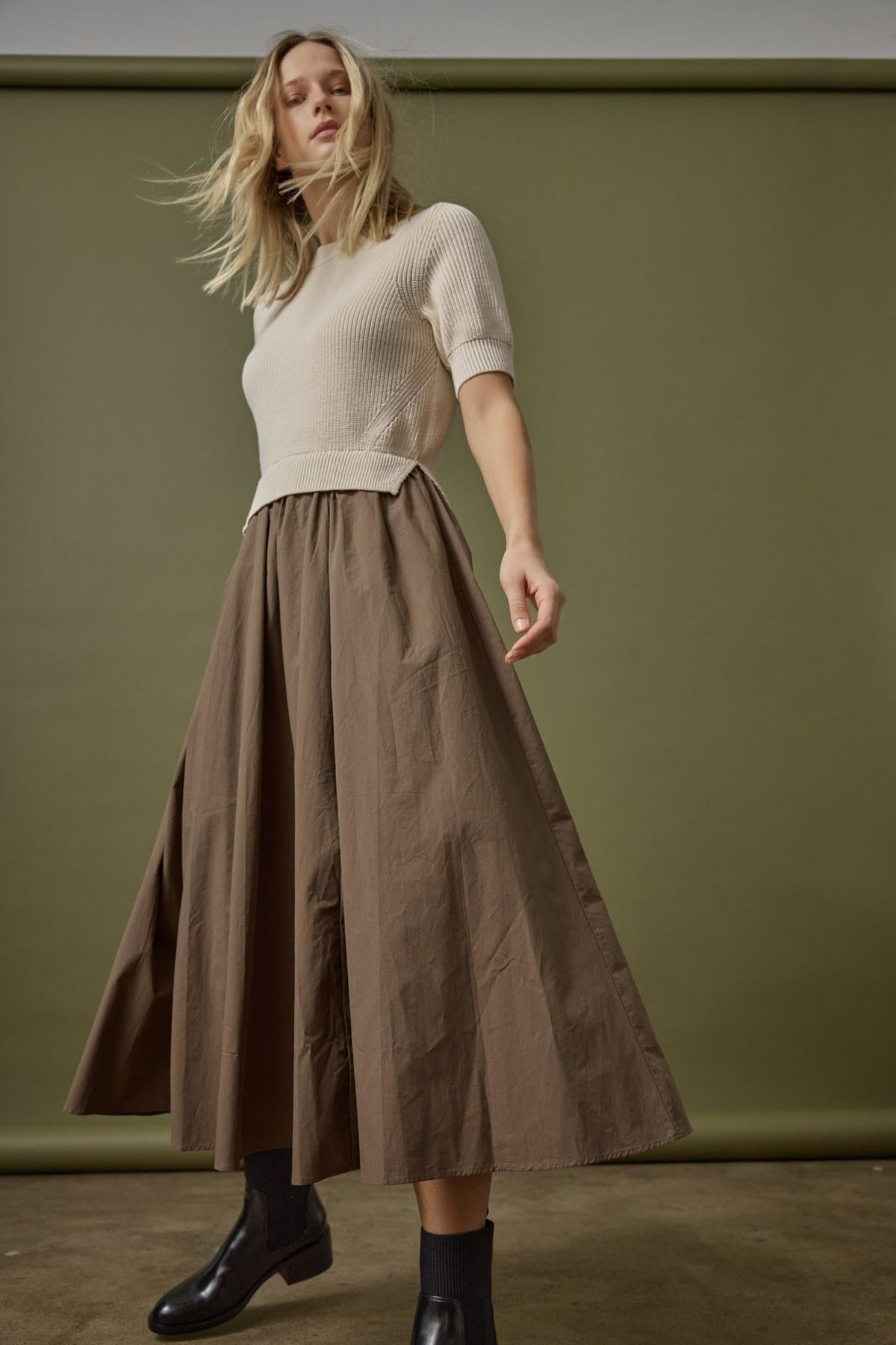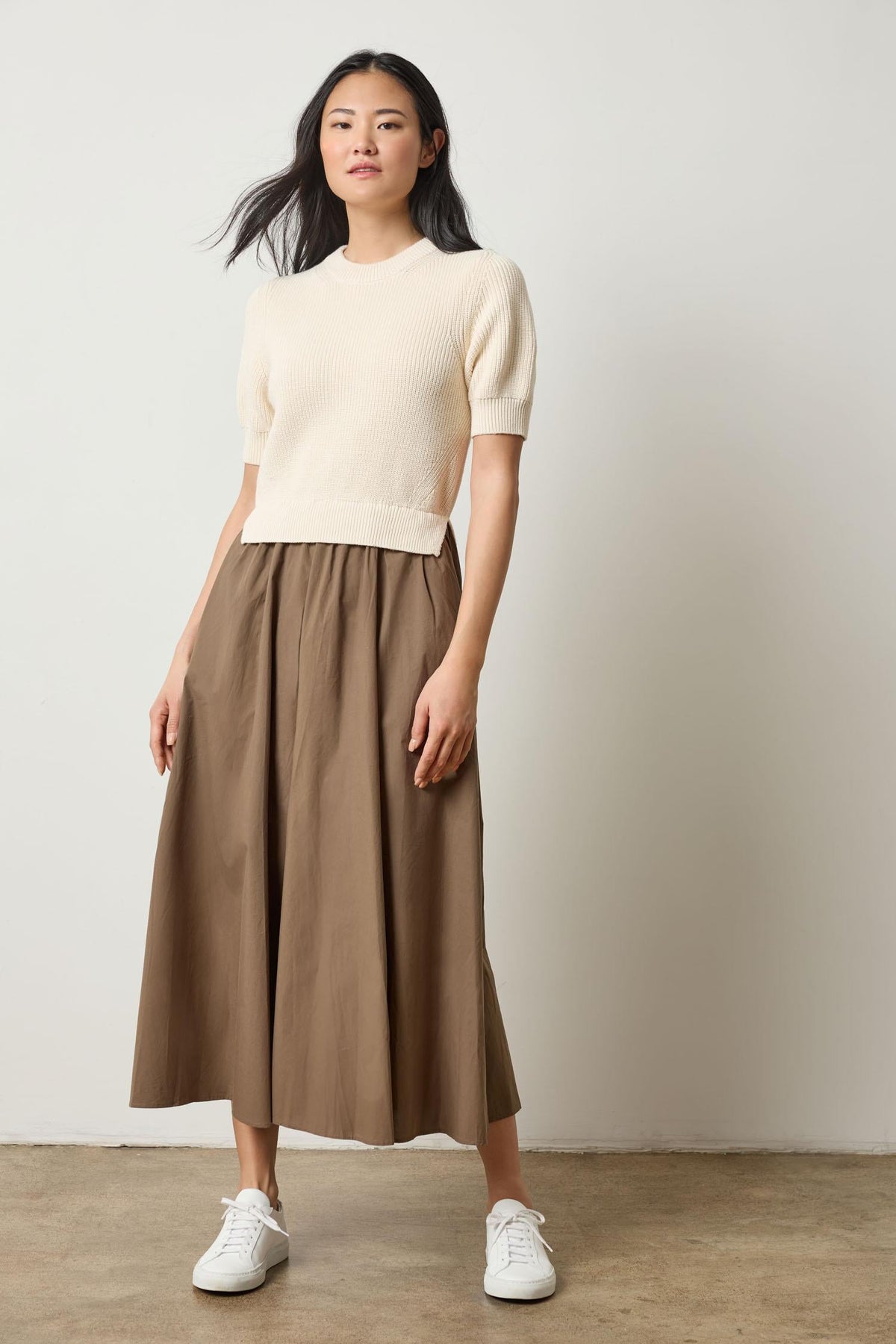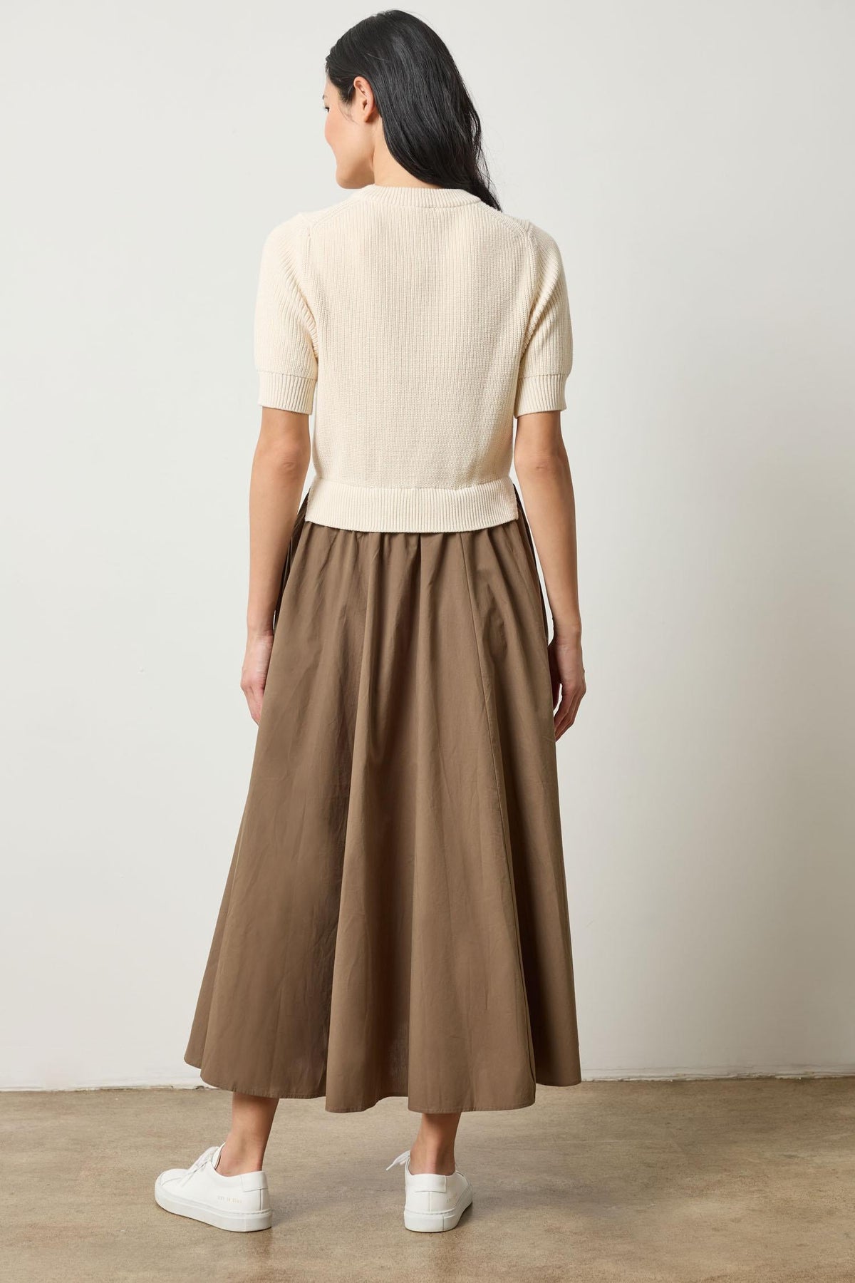 This Mixed Media Dress combines the comfort of knit with polished poplin for an effortless one-and-done look. The sweater is knit in our mid-weight eco-cotton blend yarn. Intricate stitch details and a classic crew neckline give the short sleeve sweater a classic feel. The attached poplin skirt is crisp and looks beautiful with the knit. Whether worn with sandals, sneakers, or heels, it's an easy go-to for any occasion. Available in four color combinations.