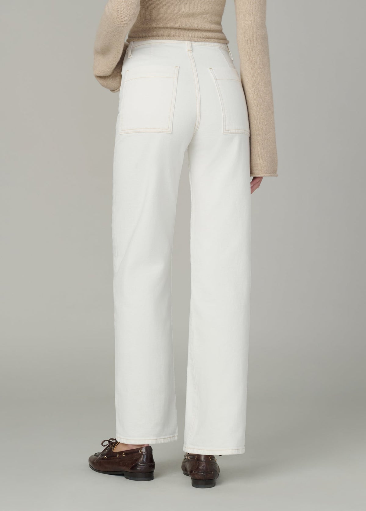 A high rise and slim fit through the waist and hip with a full-length straight leg and tailored details.