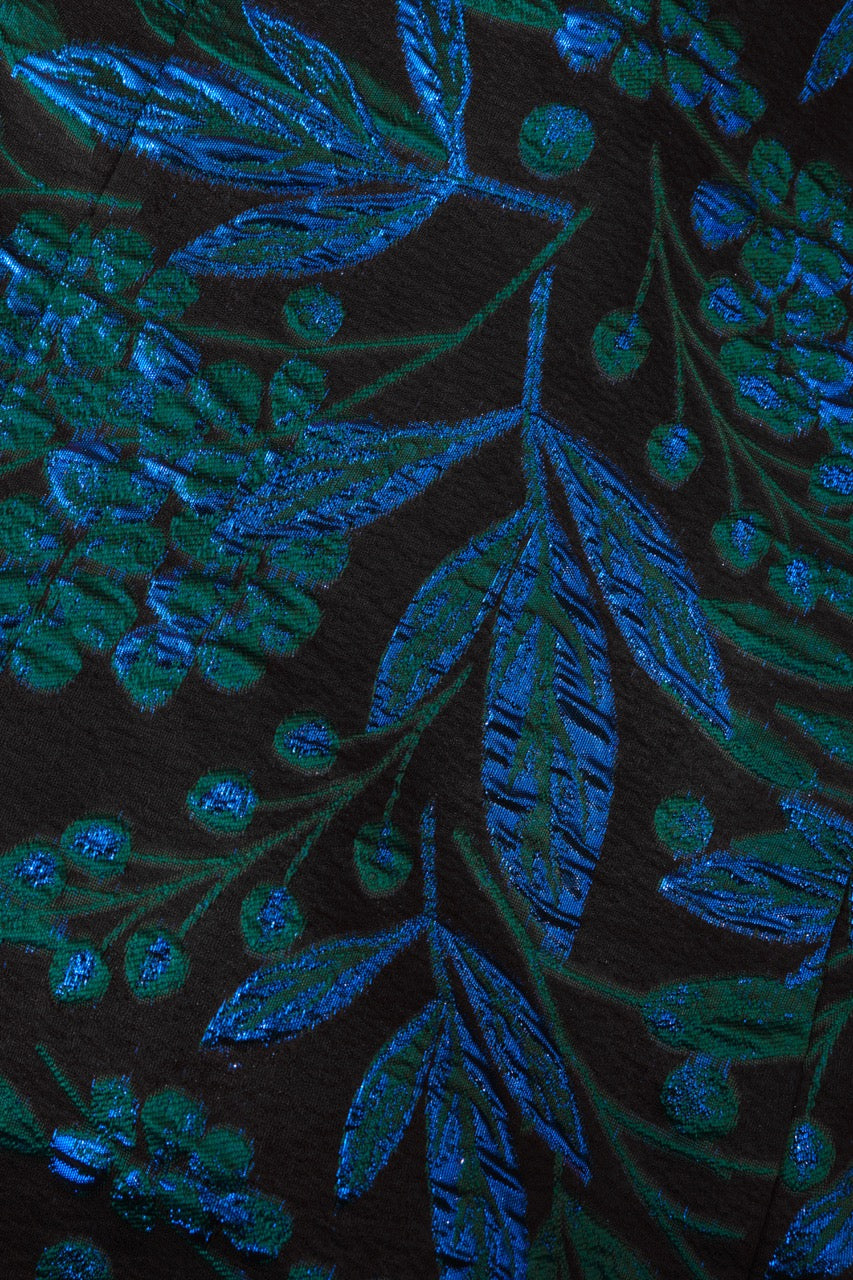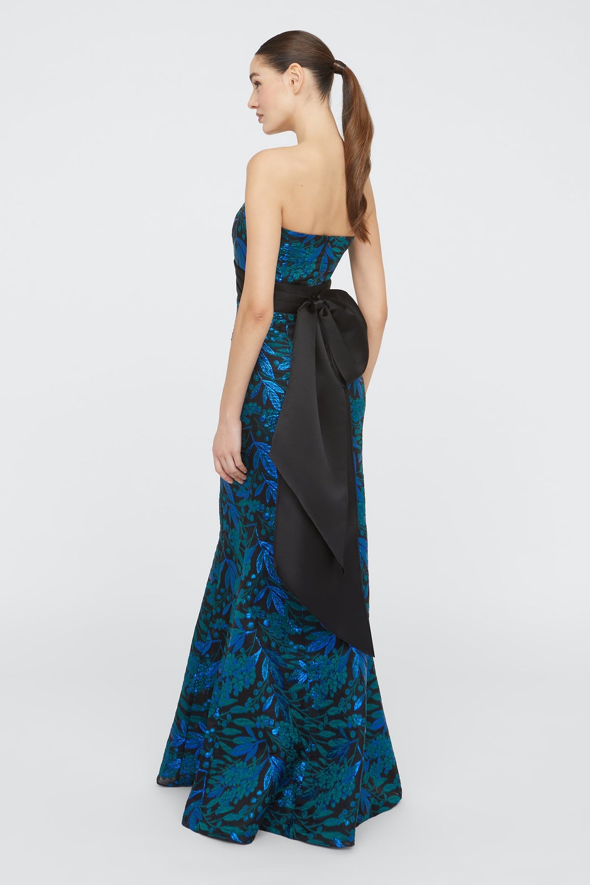Strapless jacquard fit-and-flare gown with a sculpted notched neckline and contrast Mikado waistband. The back features a dramatic bow with a cascading drape for added flair. A festive pick for winter galas, holiday receptions, or black-tie celebrations.
