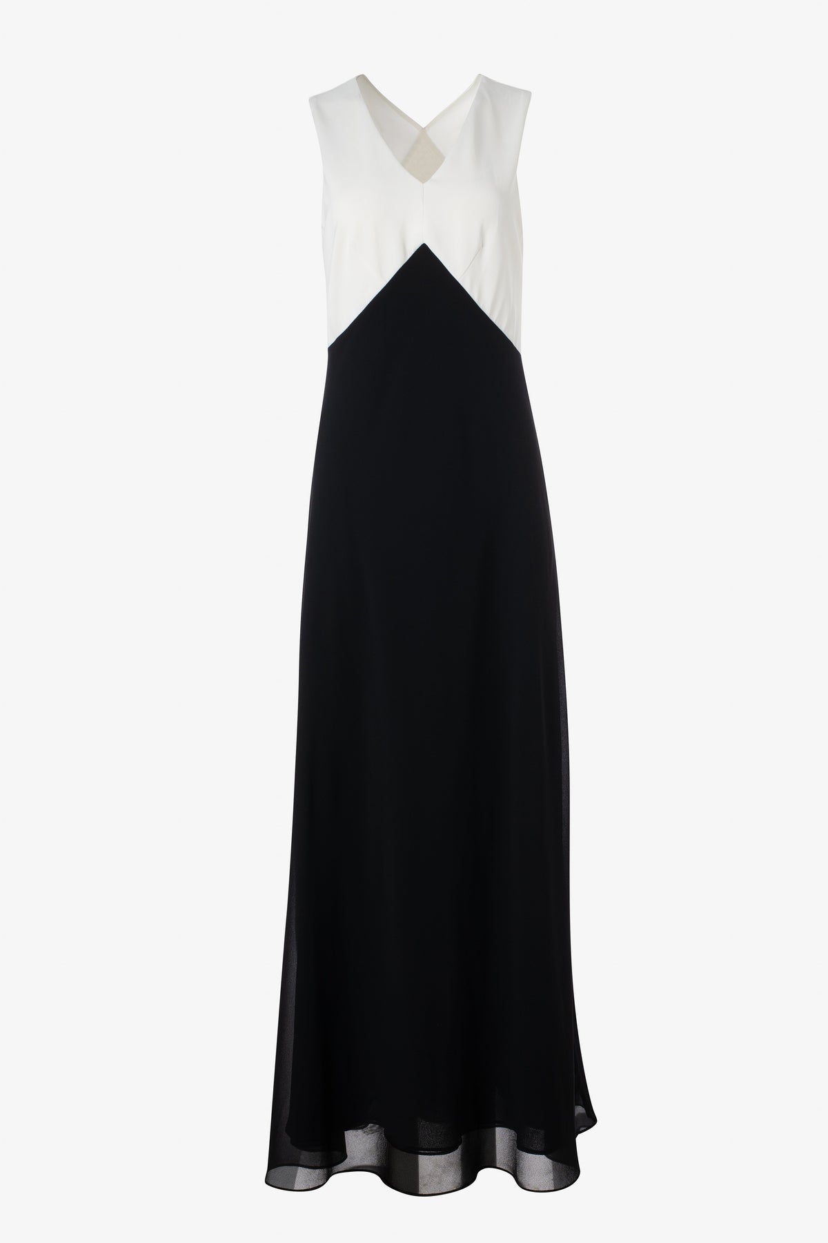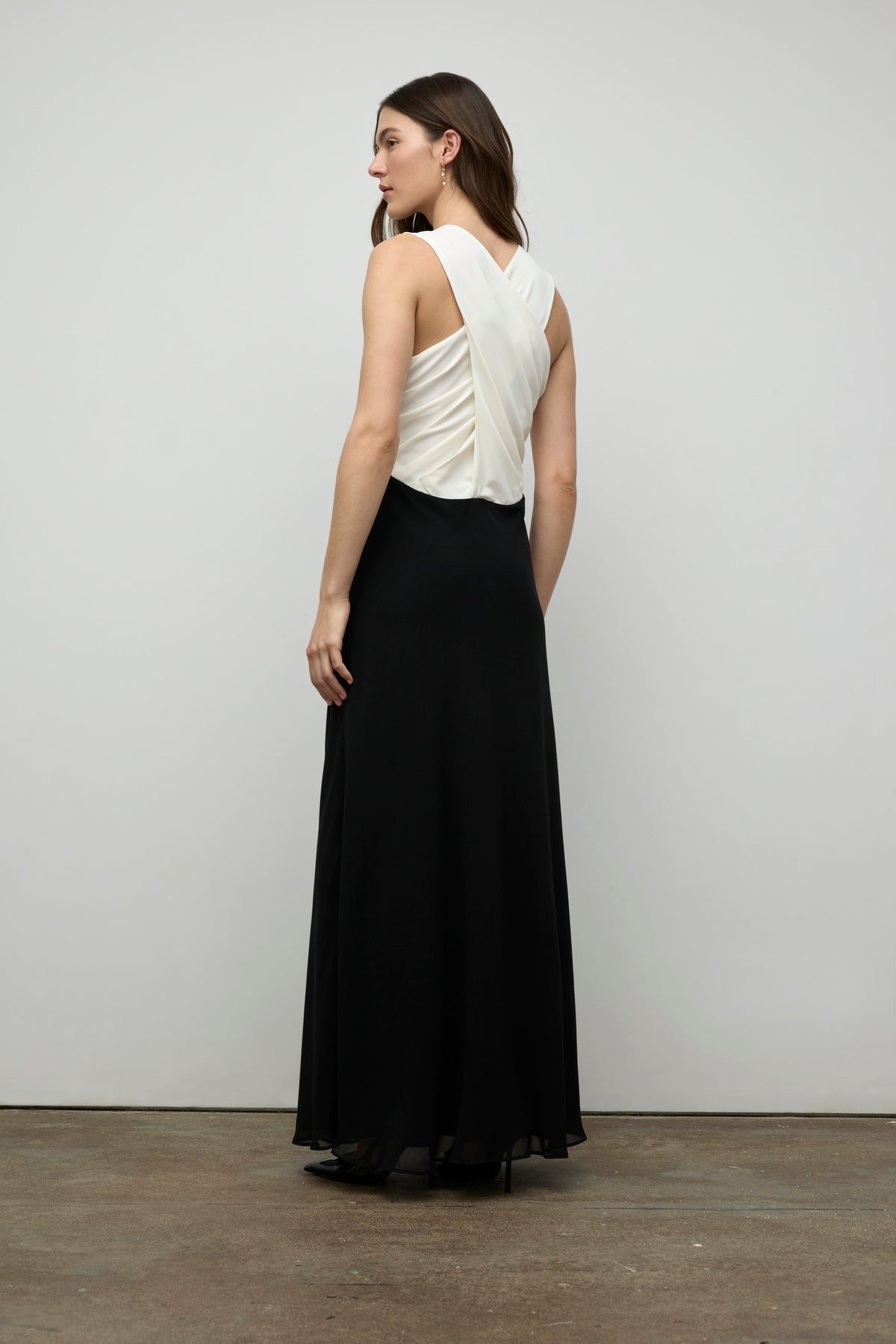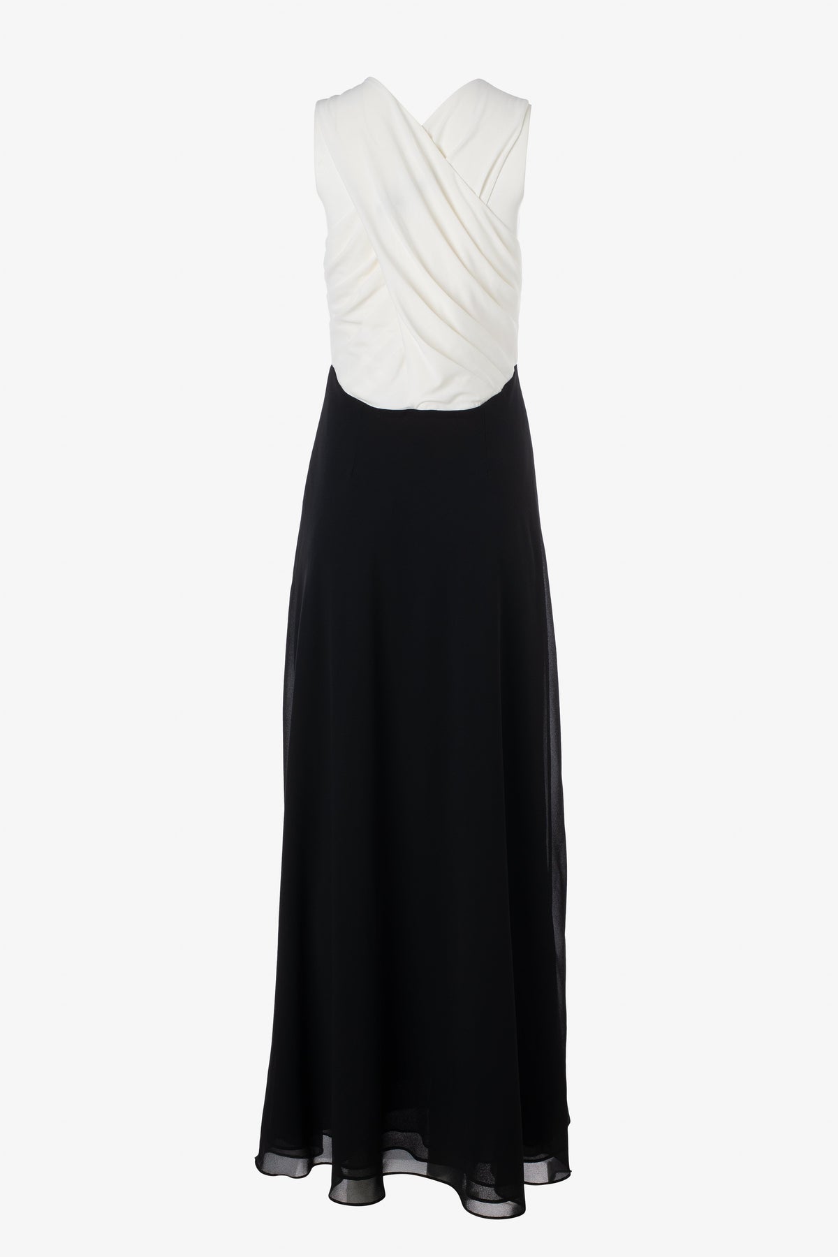 This long evening gown finely blends the comfort of jersey with the lightness of chiffon for a fluid yet structured effect. The crossed back drape creates a seductive and refined play of lines, subtly revealing the skin while ensuring elegant support. The sleek cut naturally elongates the silhouette, while the mix of materials offers a delicate contrast.