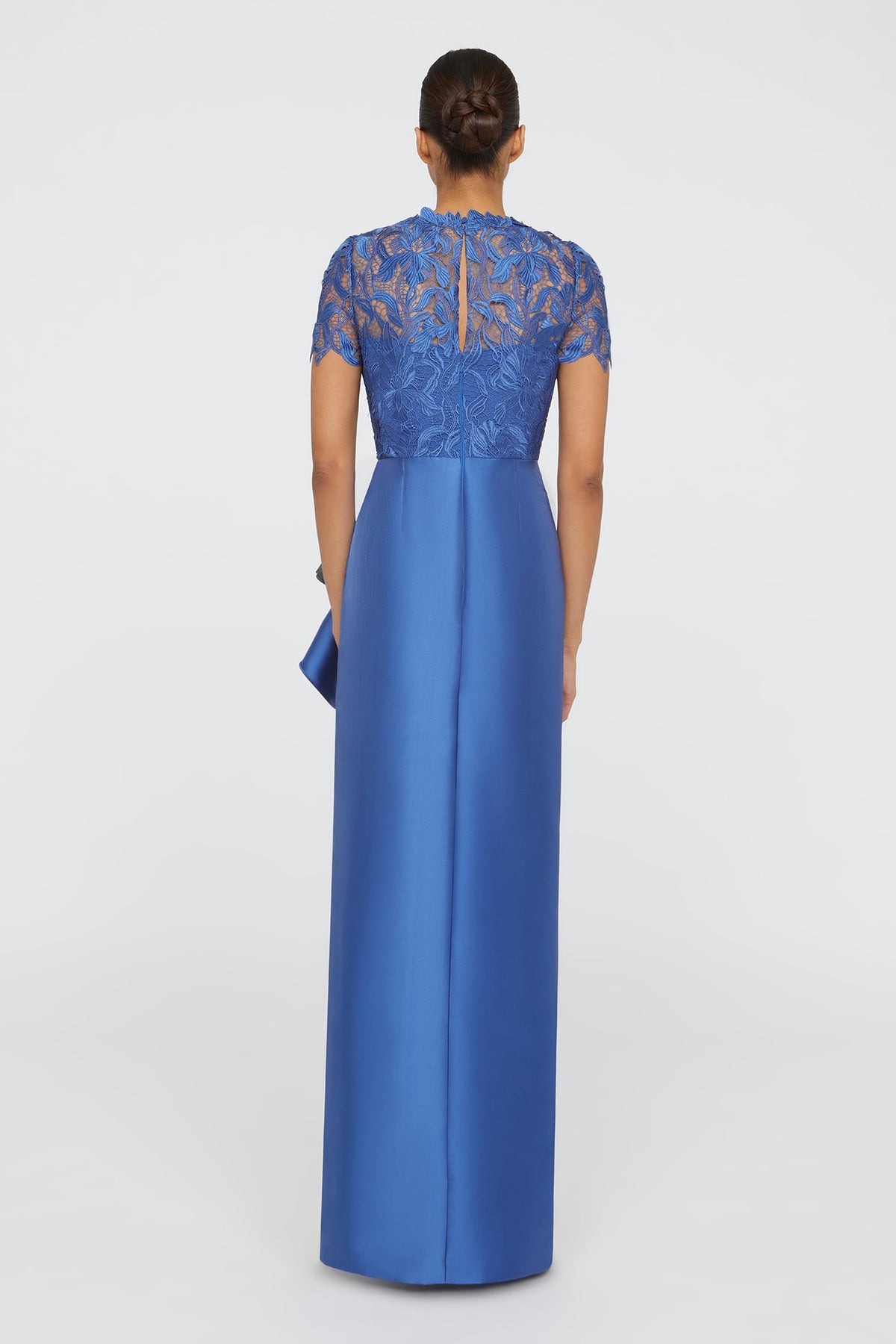 This gown features a floral lace bodice and sheer short sleeves for chic coverage, paired with a lustrous mikado skirt that wraps with sculptural ease. A front slit adds drama, while a sleek back keyhole finishes the look, perfect for gala guests, formal dinners, or black-tie weddings.