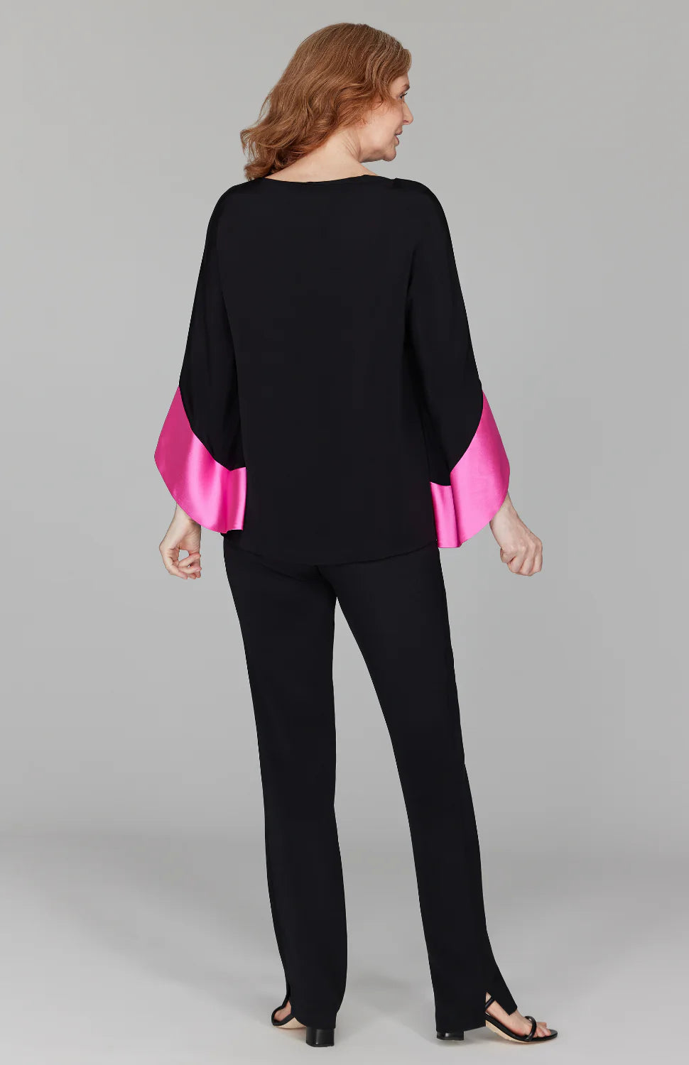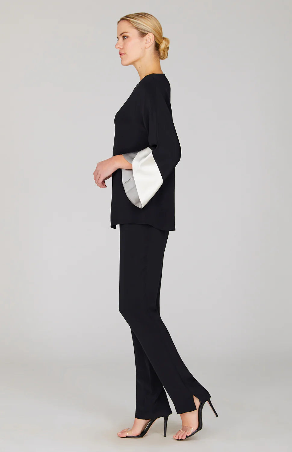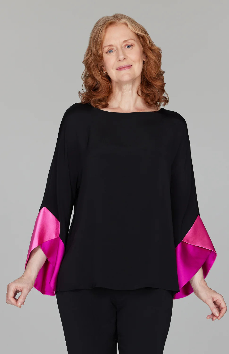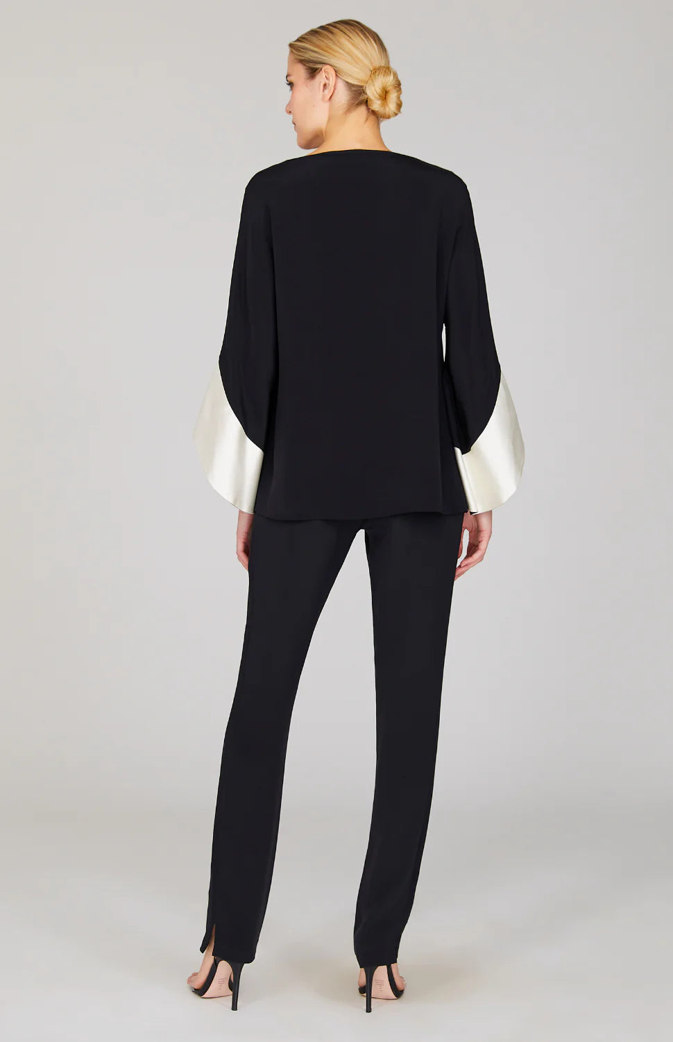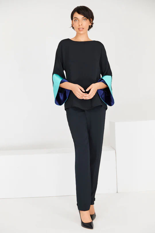 Signature silk tunic, finished with vibrant color blocked satin cuffs. An effortless statement piece for any occasion.
