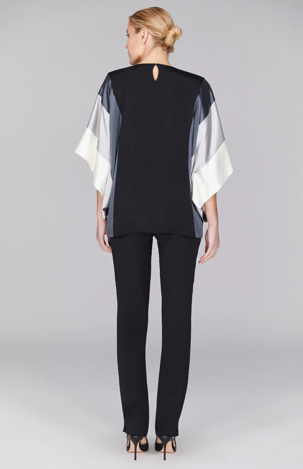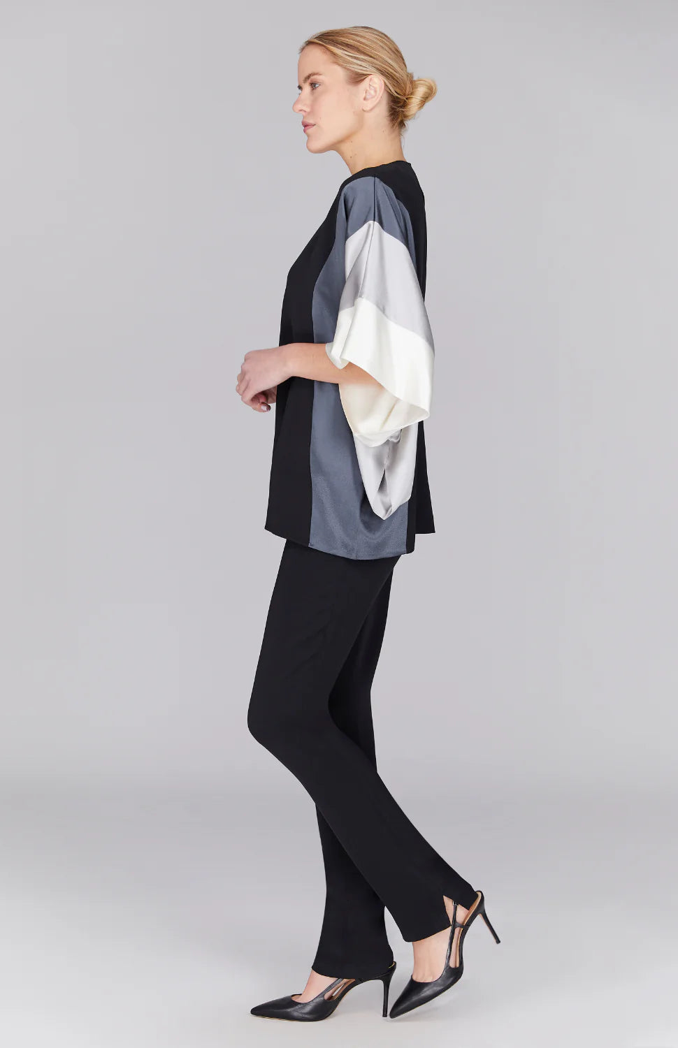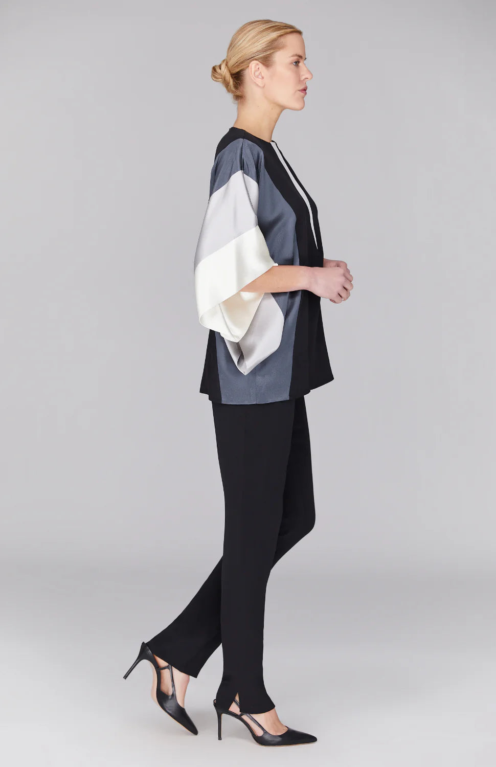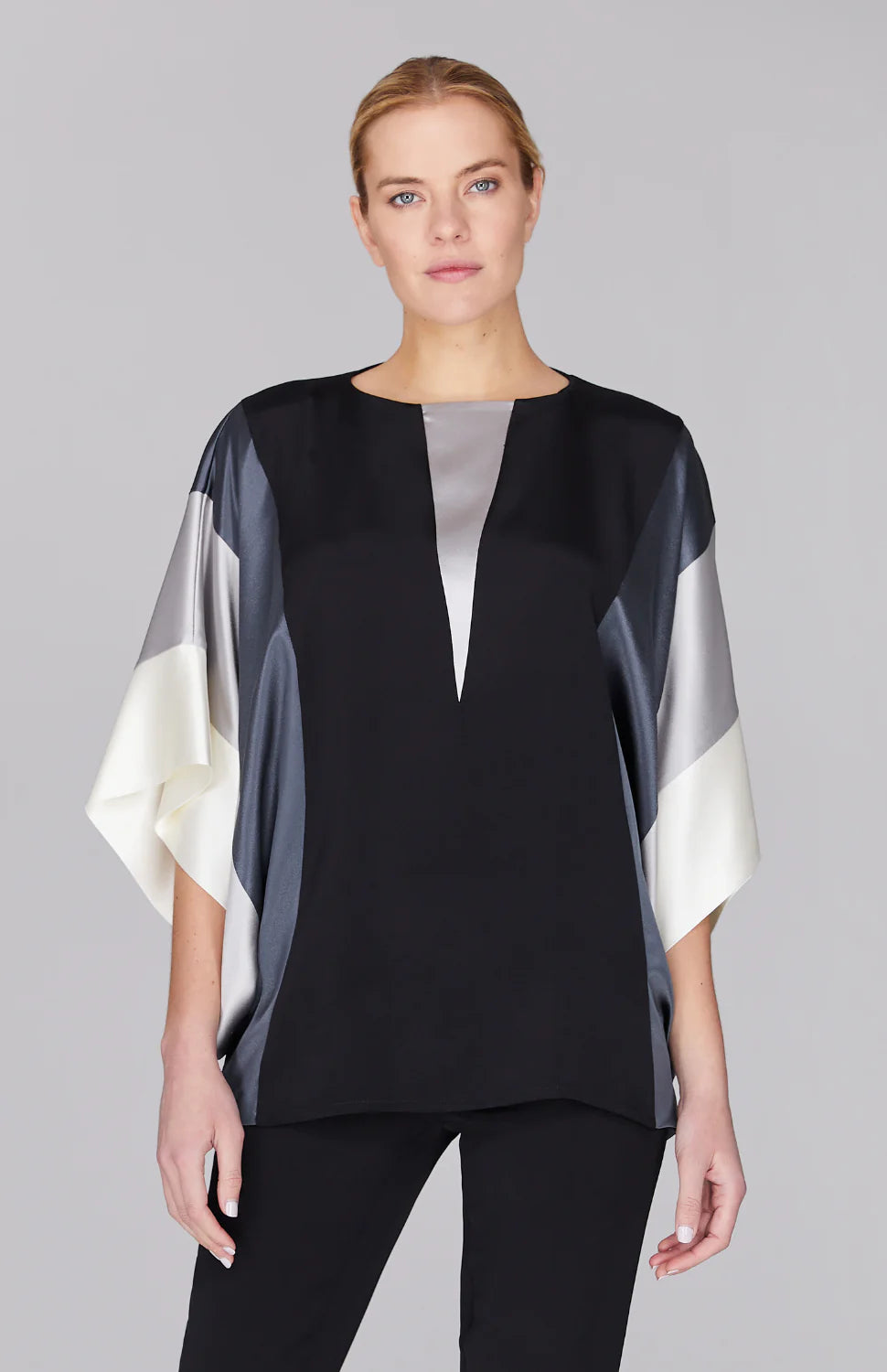 Our signature kimono inspired silk tunic, updated with a V inset for even more vibrant color. An effortless statement piece for any occasion. This is a pullover style with a hook & eye closure at the back neckline.