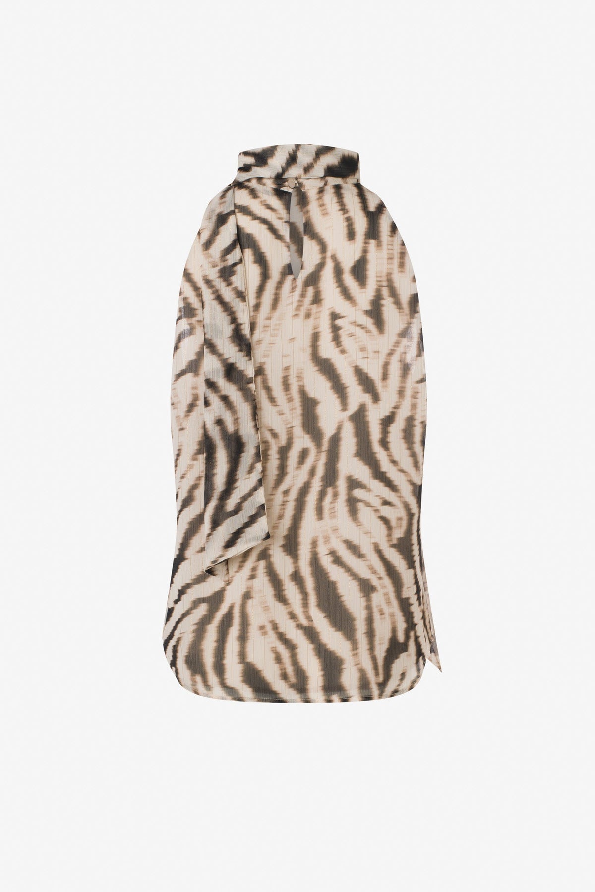 This sleeveless top features a high collar and bold abstract print. Embellished with a removable scarf it offers a versatile modern touch ideal for a contemporary look.