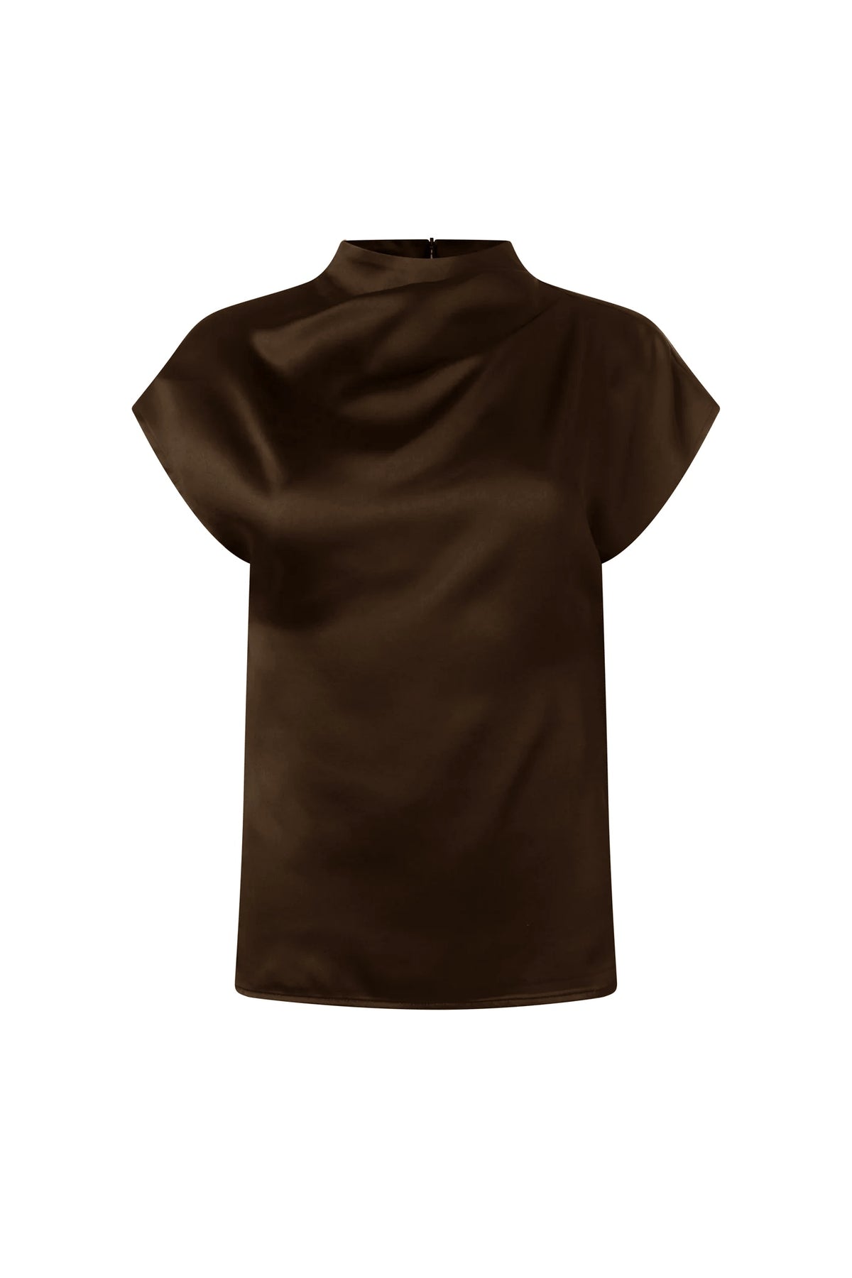 This short-sleeved satin top seduces with its draped neckline adding a touch of fluidity and elegance. Its subtle sheen and delicate cut make it an ideal piece to enhance your outfits from the office to evening parties.