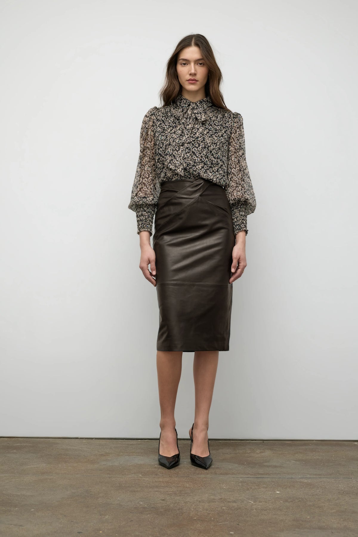 This knee-length leather pencil skirt combines structure and elegance. Its pleated waist detail adds a sophisticated touch to this statement piece.