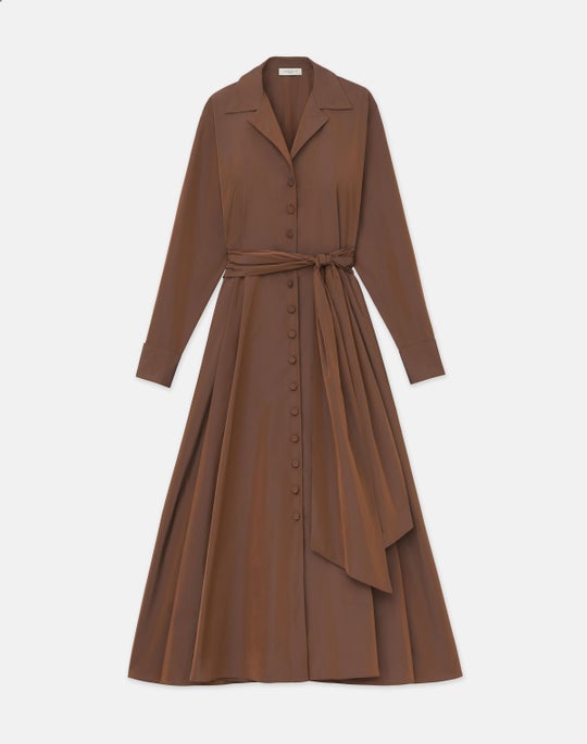This beautifully structured shirtdress is tailored from color-saturated recycled Italian taffeta with rich iridescent sheen. It's cinched at the pleated waist with elongating ties that drape the side and flares with soft volume to a sweeping calf hemline, while tonal covered buttons line the front.