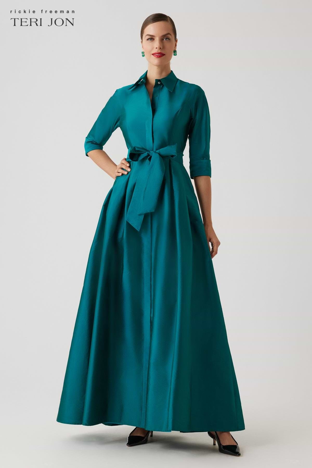 This evening shirt gown is a marvelous option for your special occasions in the fall and winter months. Fashioned from taffeta fabric and featuring a removable sash belt.