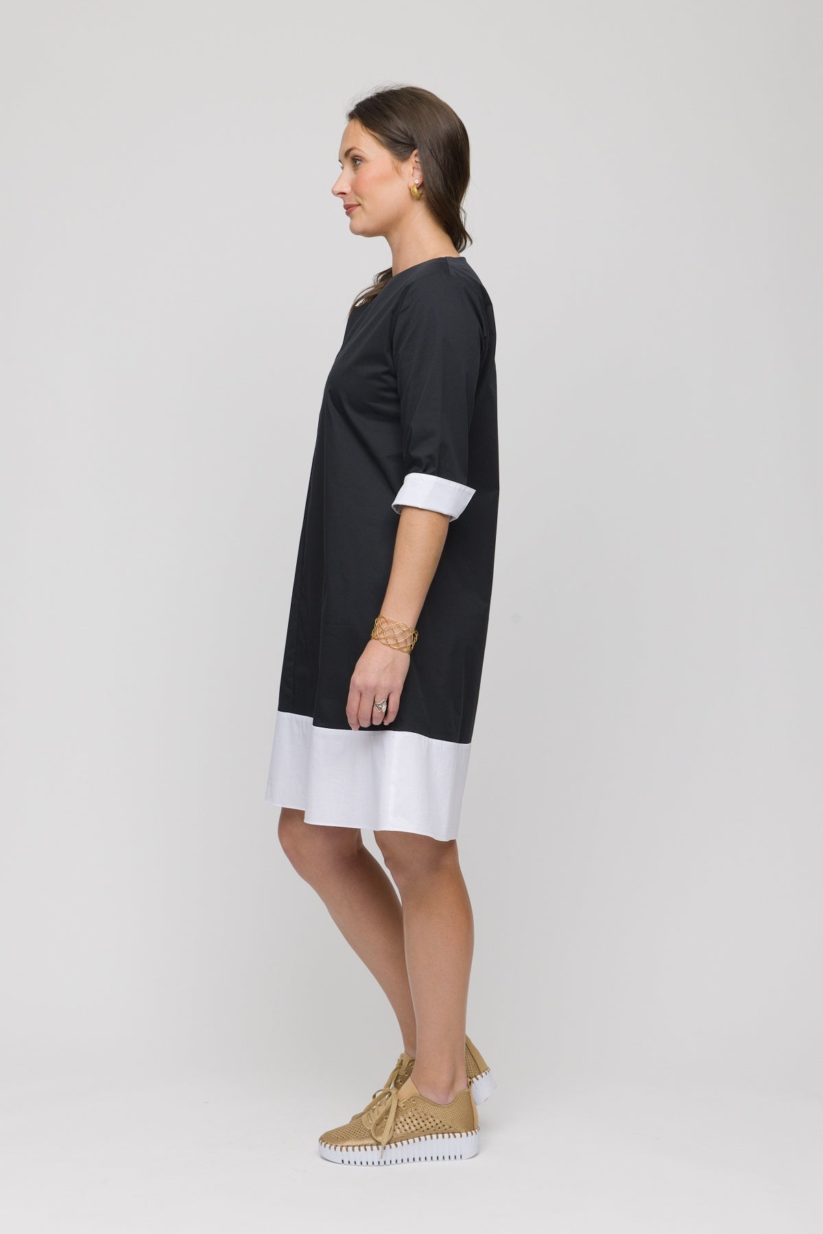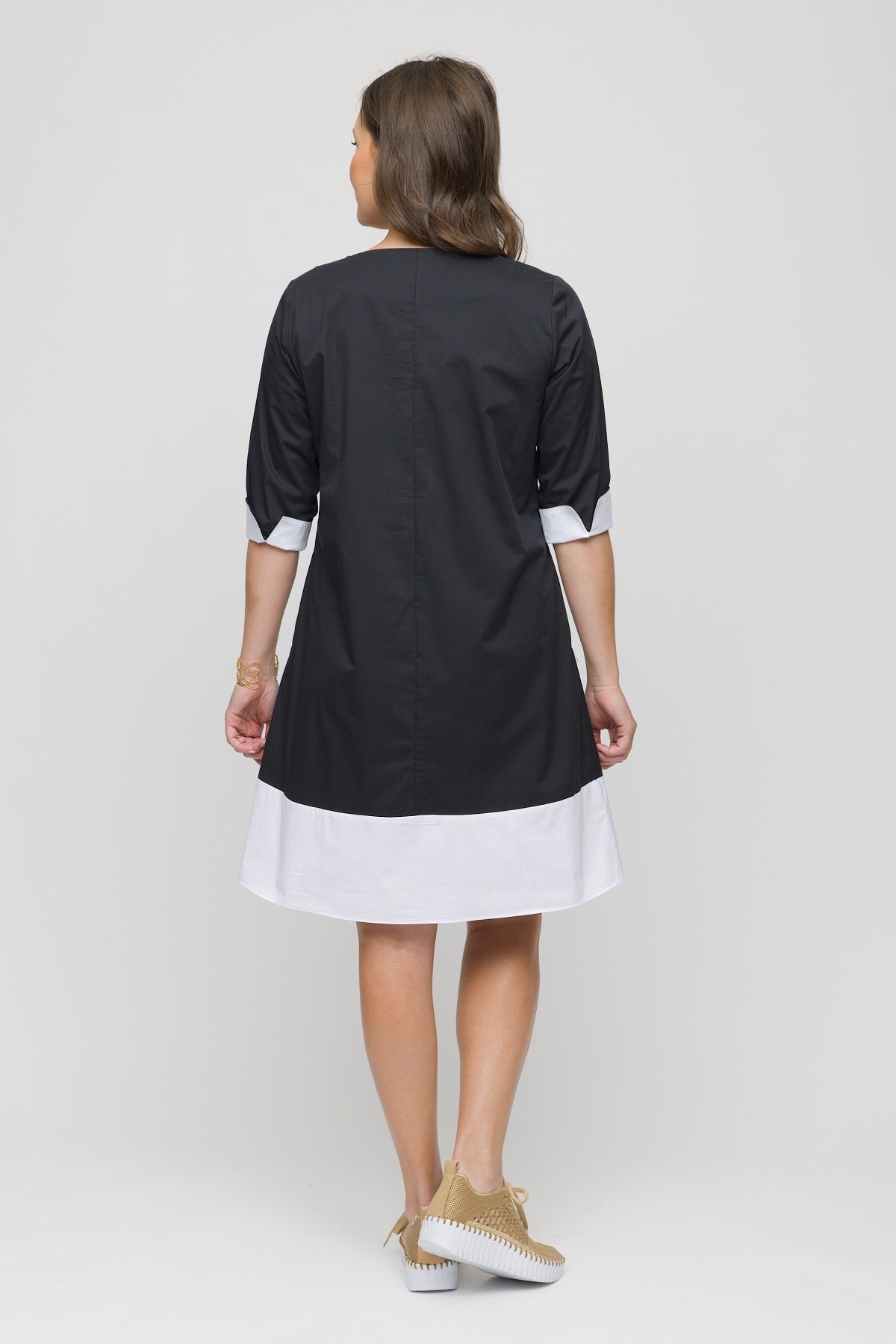 Effortlessly chic and ready for anything, this 37" dress features a flattering A-line silhouette that moves with you. The lightweight fabric keeps you cool and comfortable all day long, while the ¾ sleeves and V-neck create a polished, versatile look. Best part? Functional pockets mean you can finally ditch the bag. The wide hem adds a touch of modern flair to this wardrobe essential.