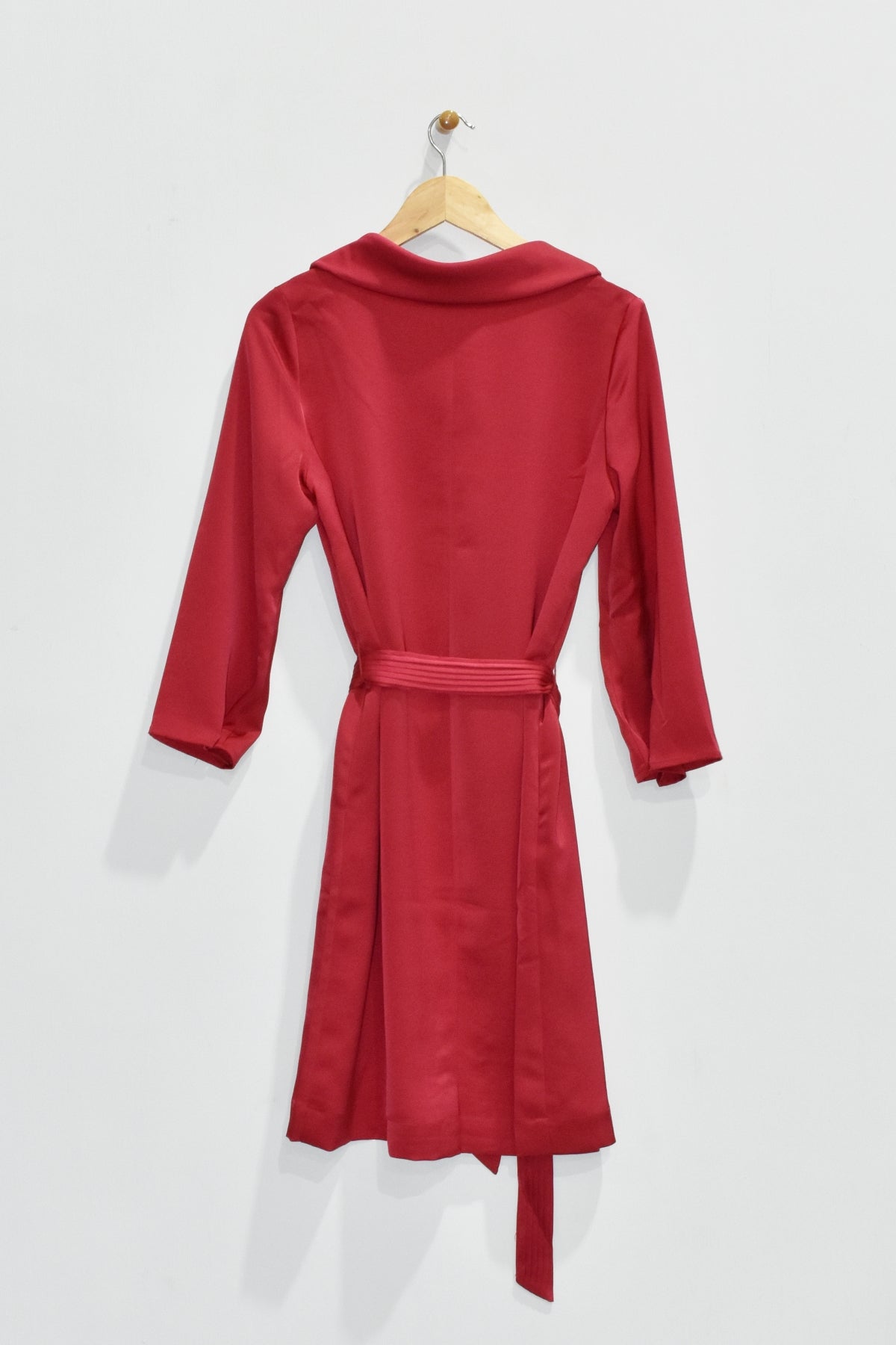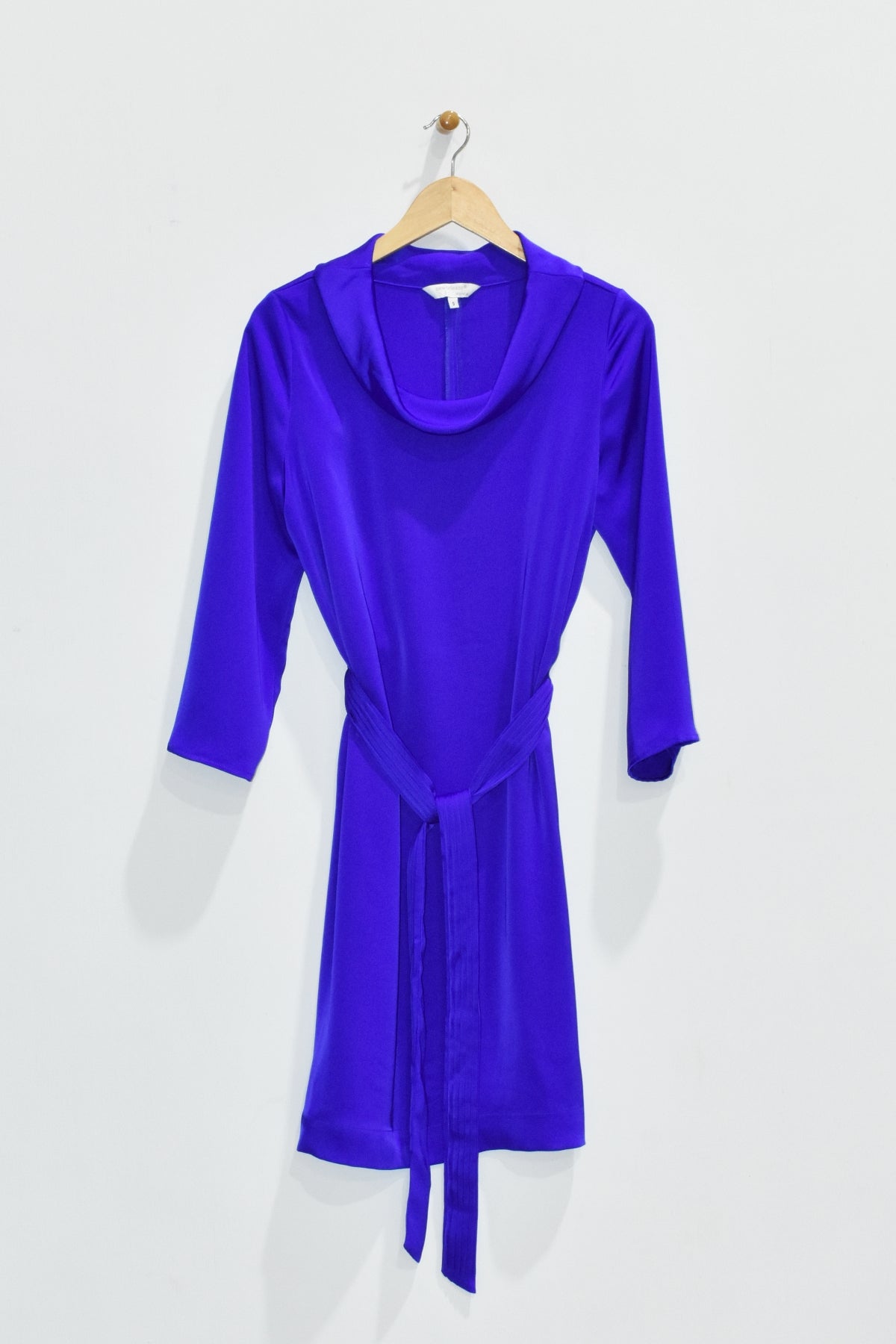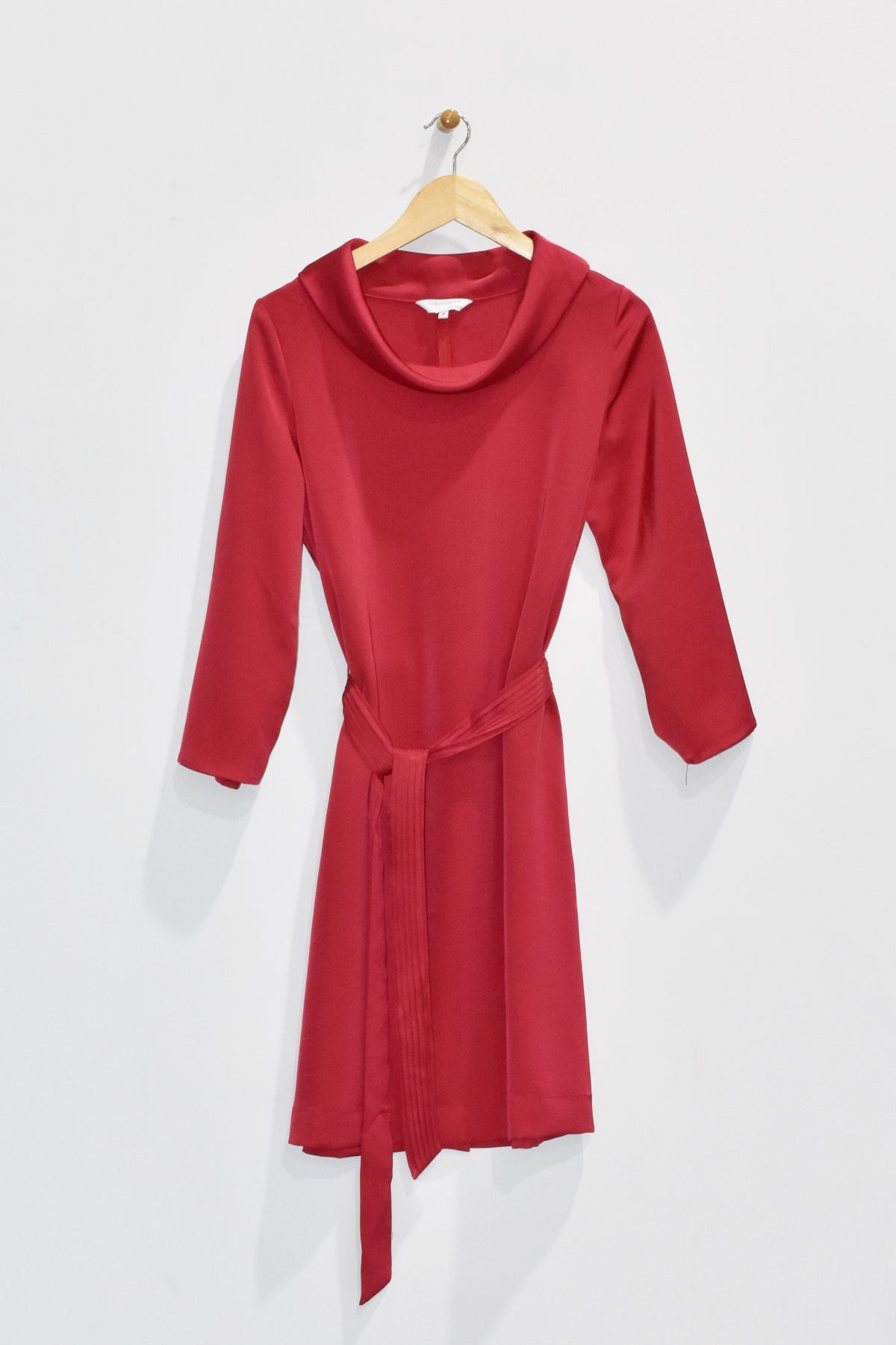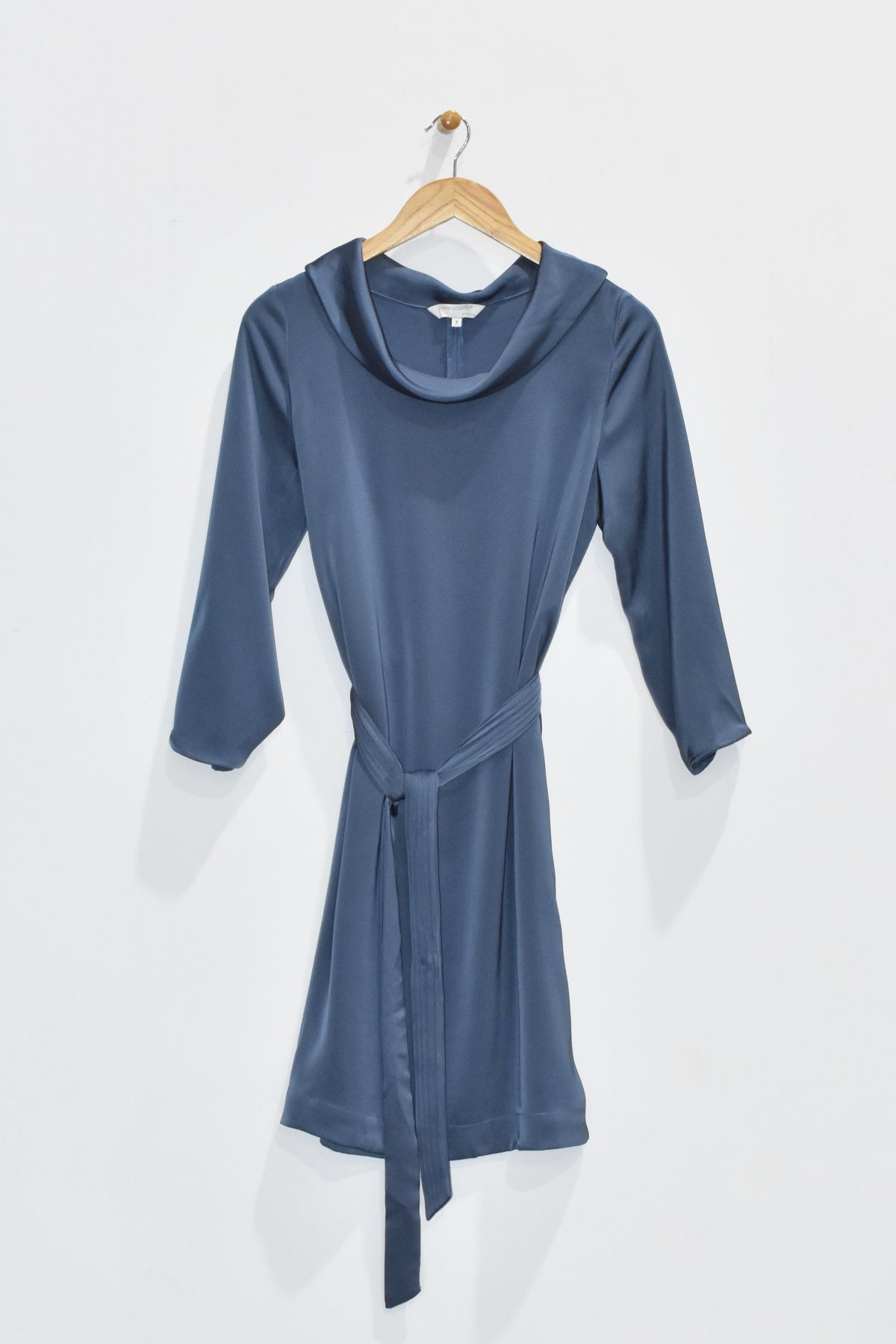 This satin dress boasts a stylish short cowl neckline and adjustable 3/4 sleeves for a sophisticated finish. Its above-the-knee length creates an elegant silhouette, complemented by handy pockets and an optional belt that lets you define your waist. Perfect for elevating your wardrobe for special events or chic daily wear.