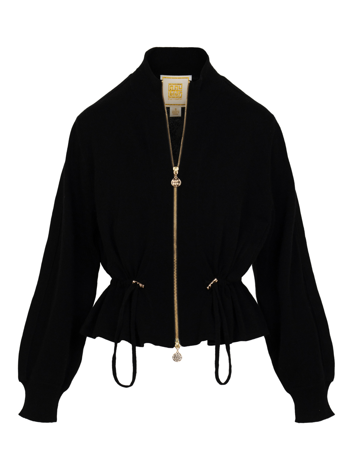 The Bailey Bomber in Midnight Cashmere reimagines a classic bomber silhouette with elevated ease. Crafted from 100% cashmere, this style features a stand collar, softly puffed long sleeves, and an adjustable peplum hem that creates a flattering shape. Finished with a two-way zipper and golden logo pull, this luxe layer adds modern polish to your everyday wardrobe—where comfort meets sophistication.