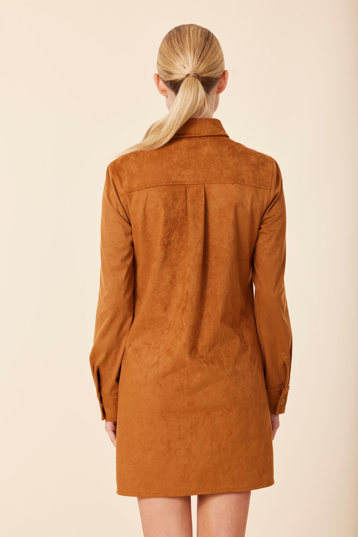 Channel rustic-chic style this Fall with our burnt orange faux suede shirt dress, featuring a collared neckline, snap button front, and flap chest pockets. The soft, textured fabric and relaxed silhouette make it a versatile piece in women’s Fall fashion—perfect for pairing with boots or layering under jackets for a cozy, seasonal look.