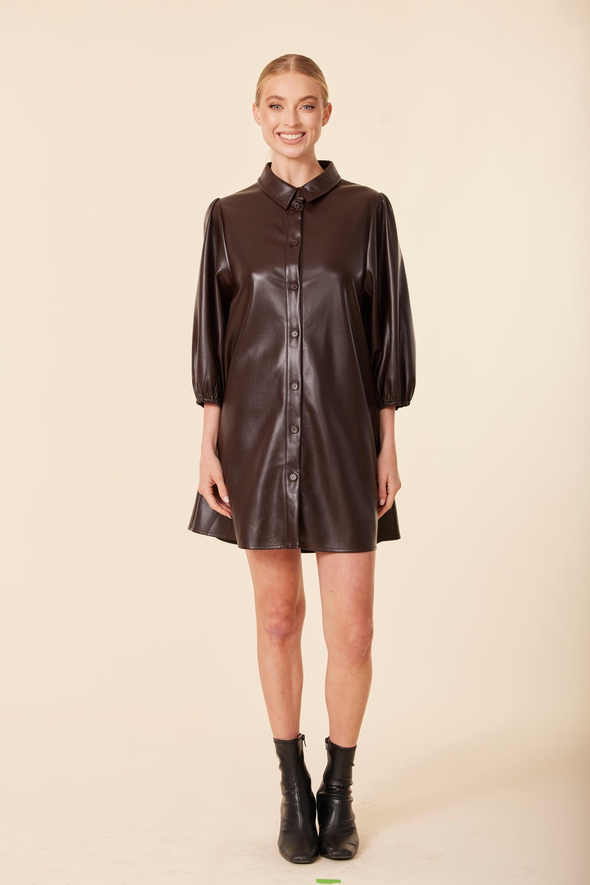 Step into chic sophistication this season with our Best Selling faux leather shirt dress, a perfect statement piece for Fall fashion — now available in new colors. Featuring a classic collared neckline, full button-down front, and puffed 3/4 sleeves, this versatile Fall dress pairs effortlessly with boots or heels for a polished day-to-night look. Crafted from buttery-soft vegan leather, it’s the ultimate blend of style and comfort for your Fall wardrobe.