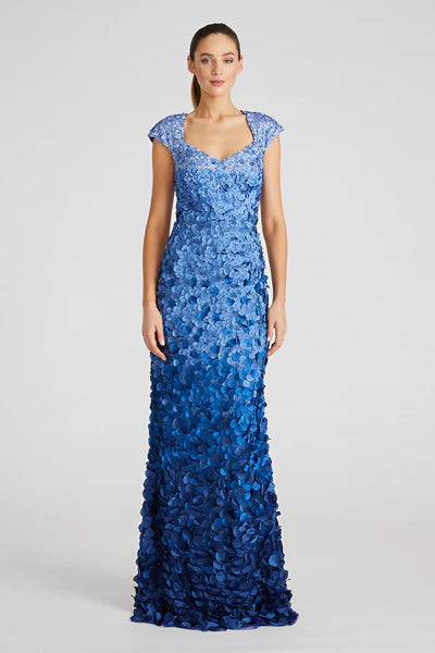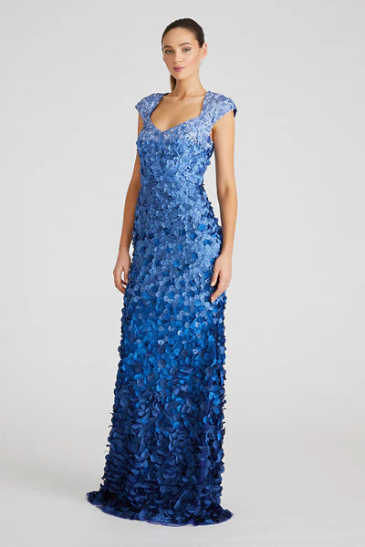 Experience the evolution of classic Theia petal dresses with our fully hand-embellished fit and flare gown in ombre blue hue. The sweetheart v-neckline and cap sleeves add a touch of elegance, while the satin finish completes the look.