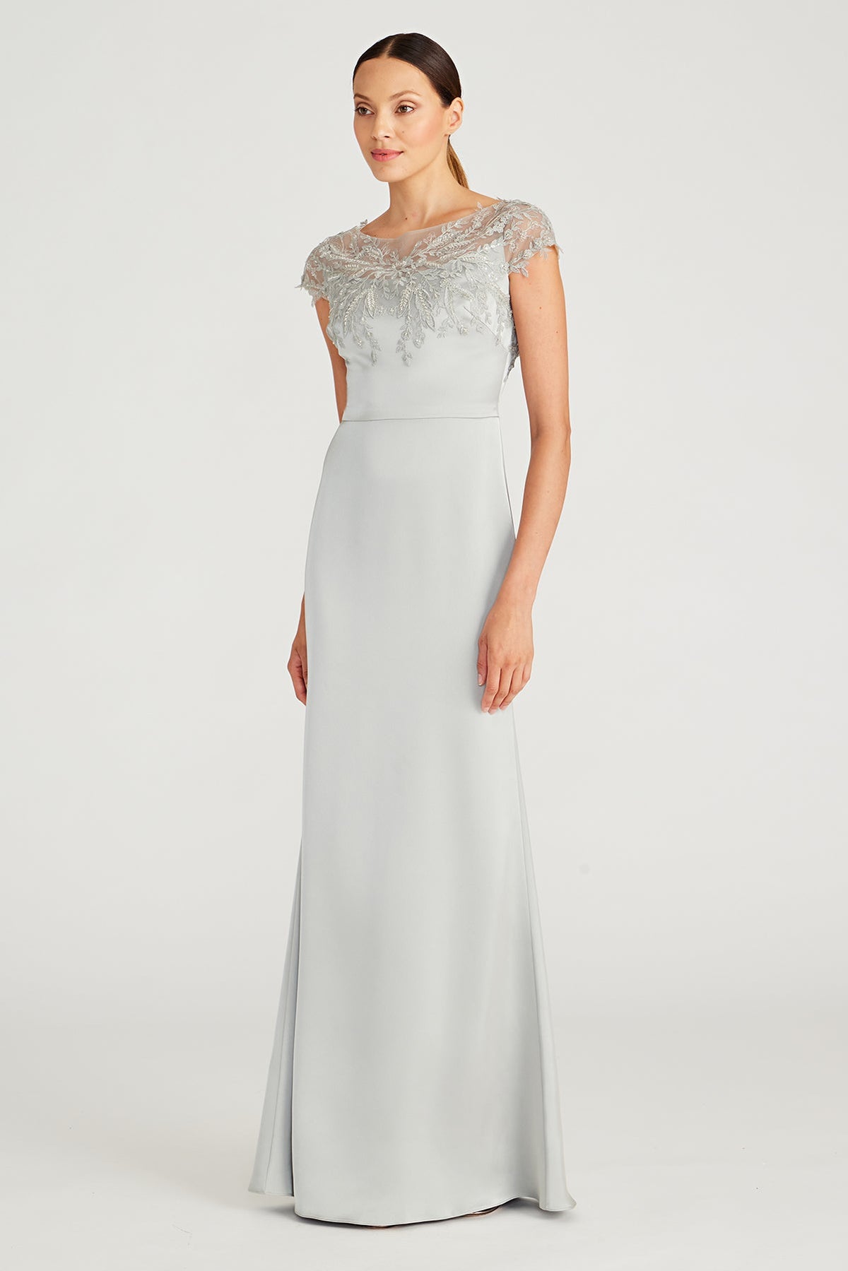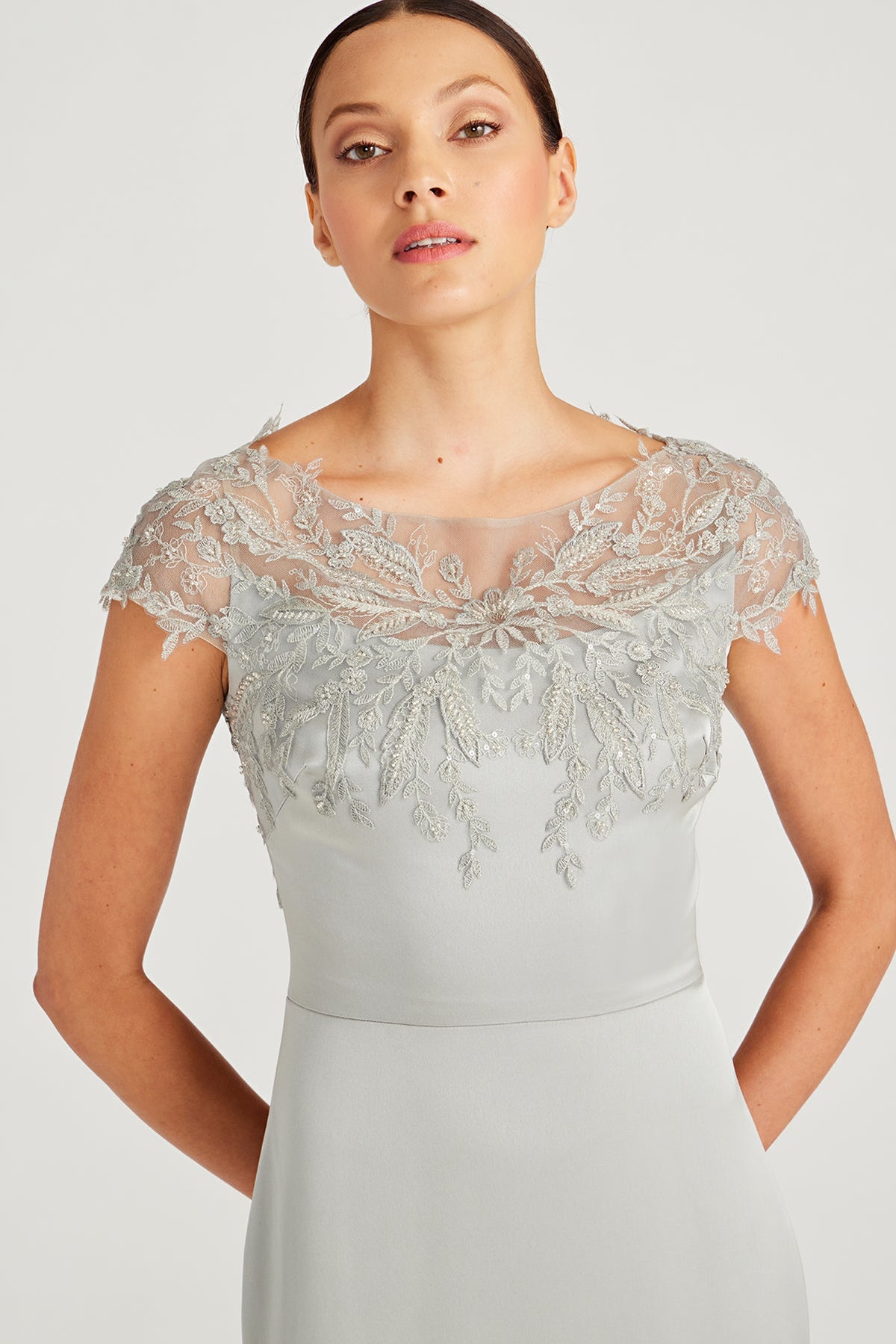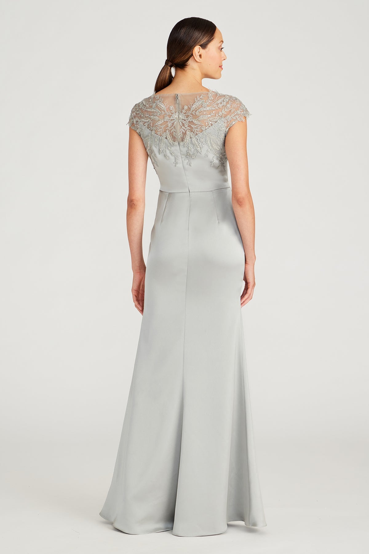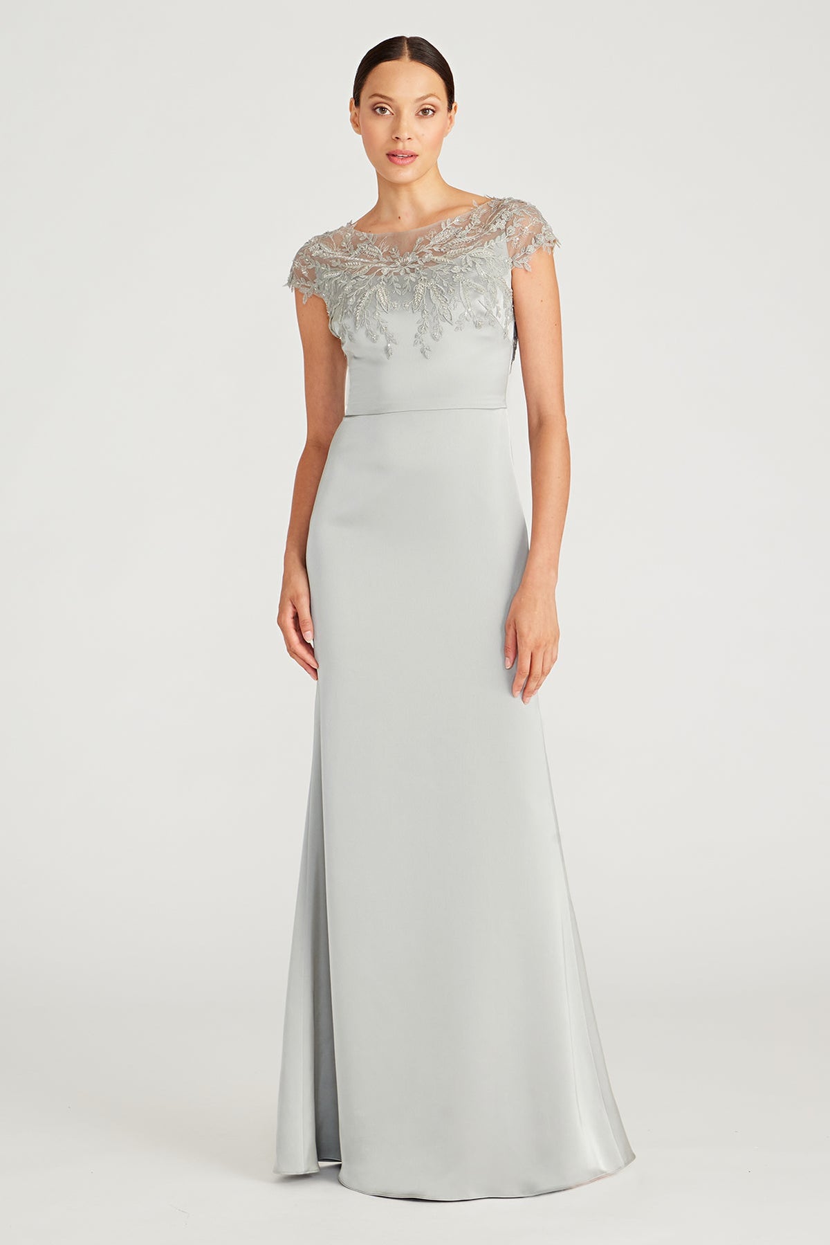 Step into an era of understated elegance with the Cosette Applique Satin Gown, which boasts a sheer beaded lace yoke leading into cap sleeves with vine embroidery for an organic, delicate form. The fit and flare silhouette in luxurious double-faced satin, accented with a subtle beaded motif, echoes the clandestine chic of the 1920s with a whisper of rebellion.