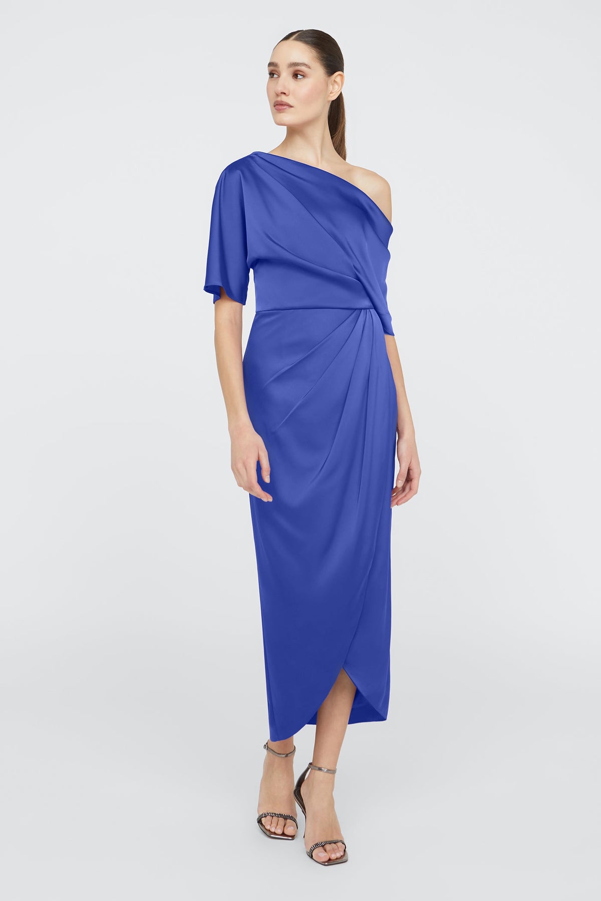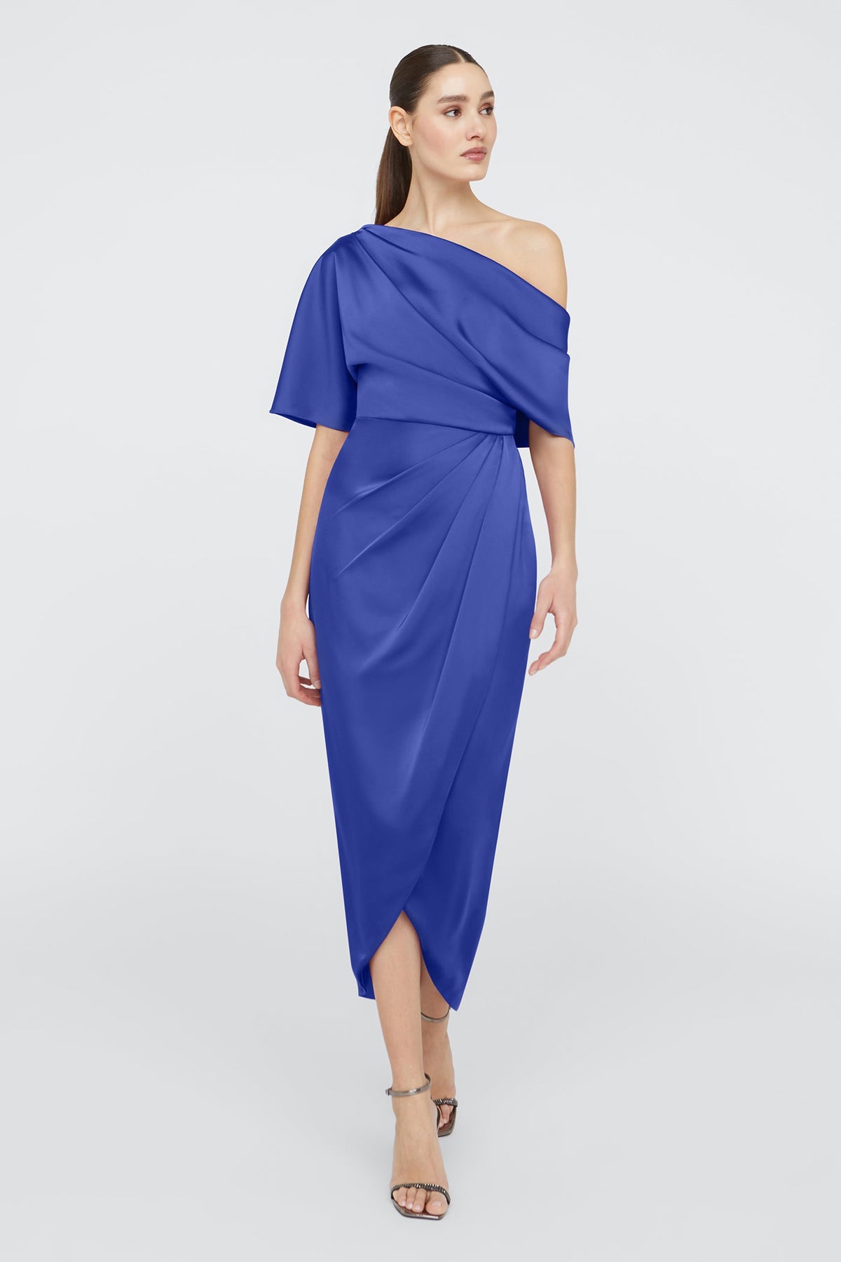 Introducing the Rayna gown, a minimal masterpiece made with smooth and elegant satin. Framed by an asymmetrical neckline, it features a one-sleeve detail and faux wrap skirt on a brilliant silhouette.
