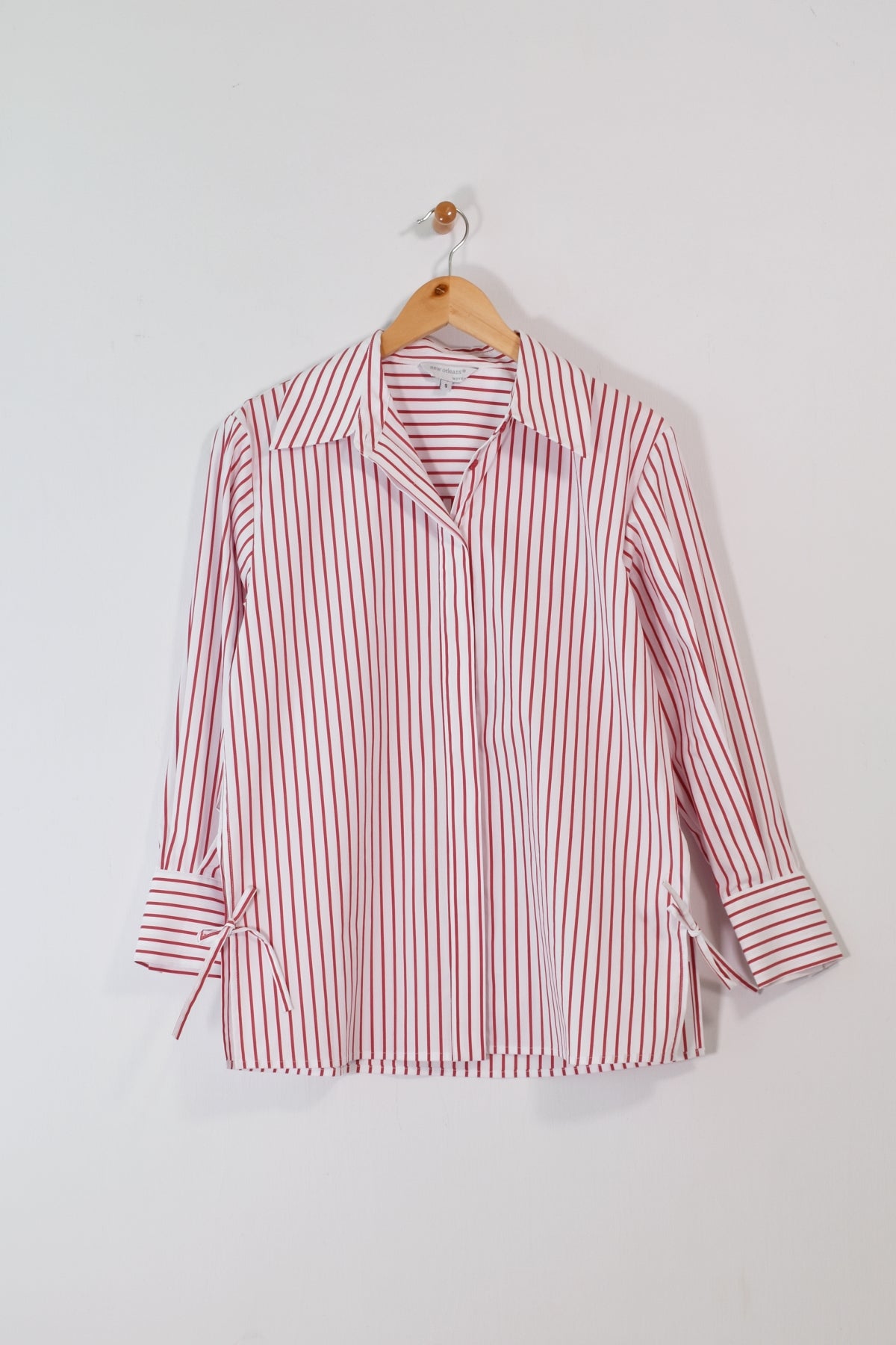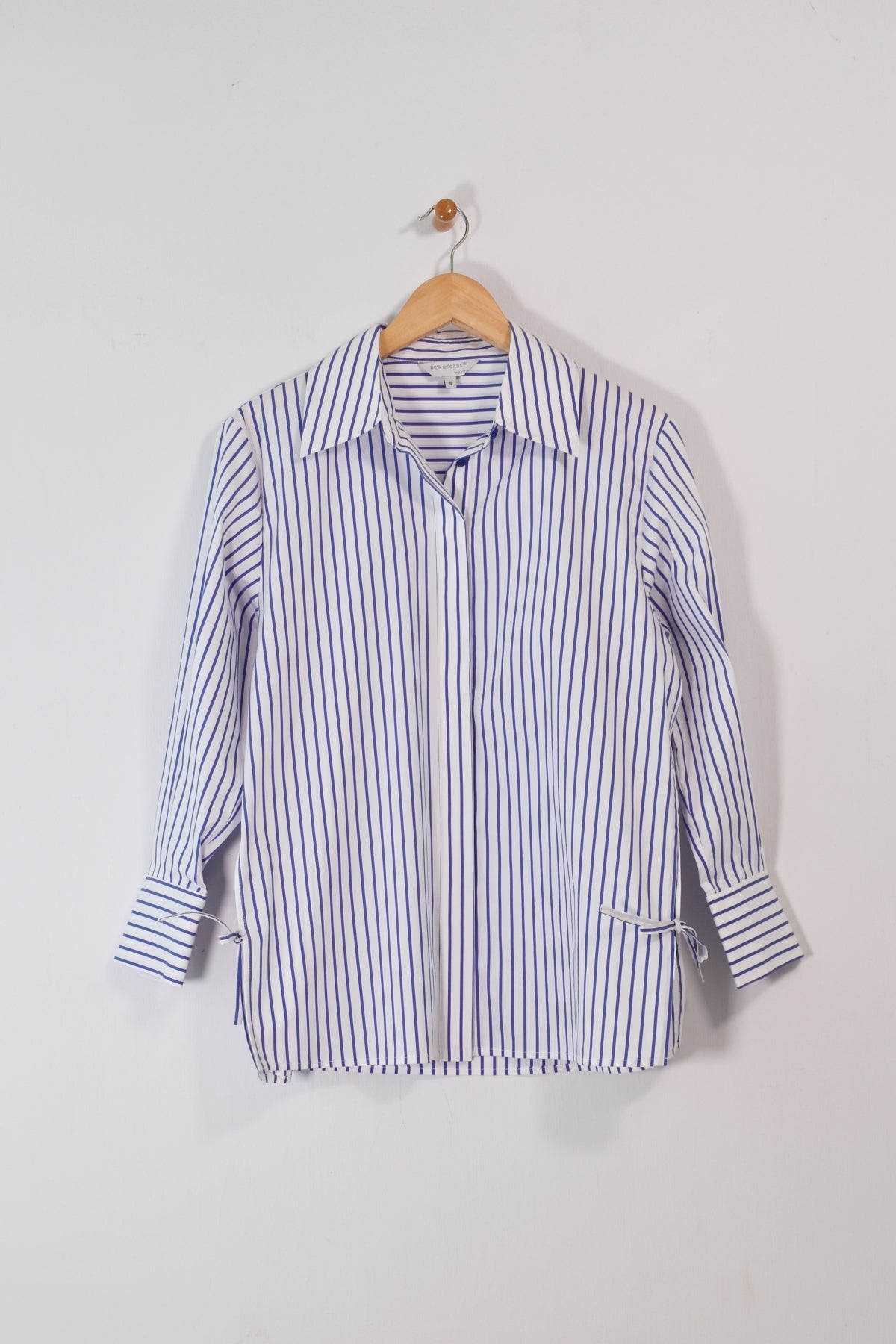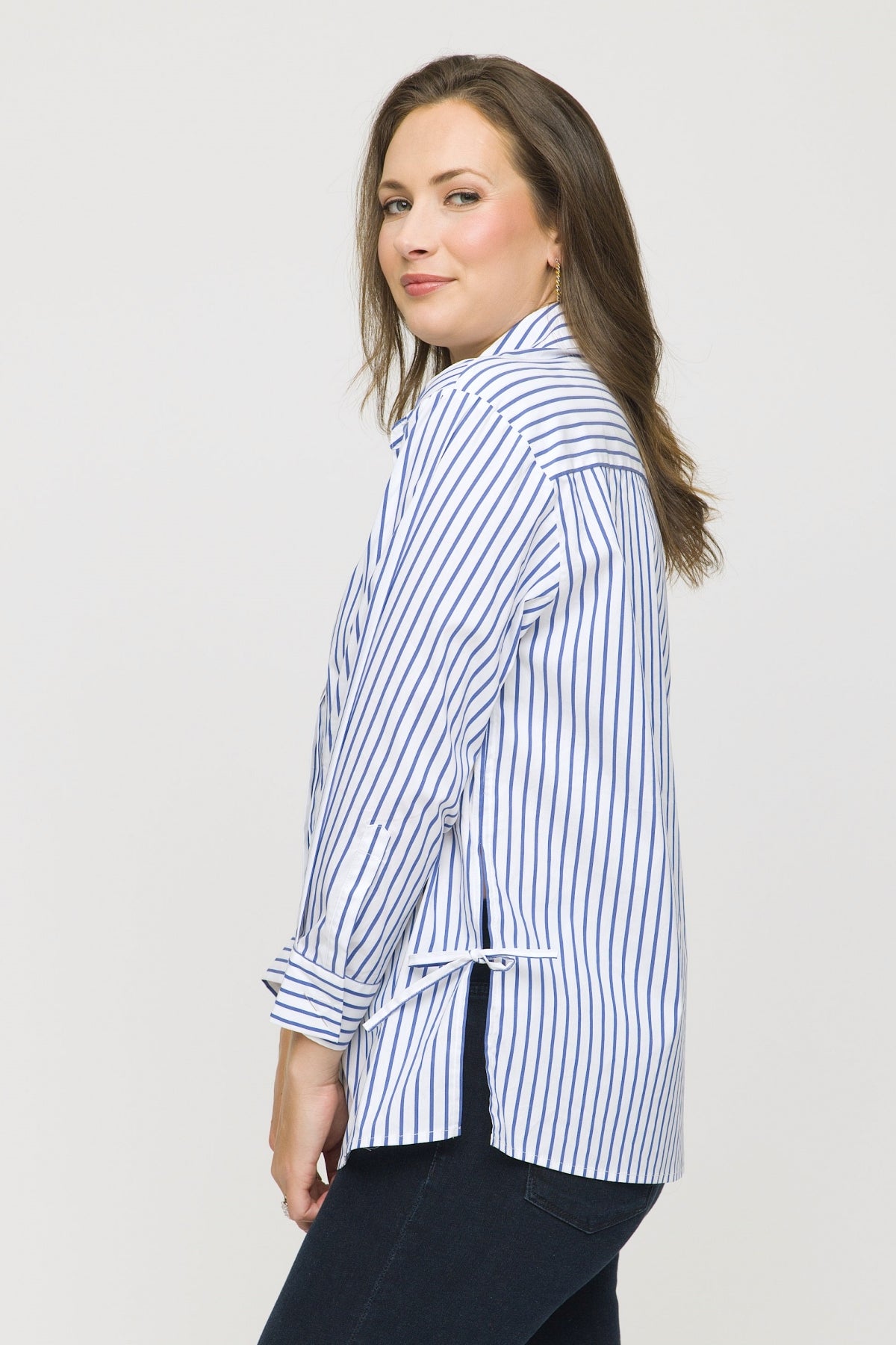 Elevate your wardrobe with this 27" oversized shirt featuring long sleeves and stylish side ties at the hips. The classic striped pattern adds a timeless touch, while the relaxed fit ensures all-day comfort. Perfect for layering or wearing on its own, this versatile piece effortlessly combines fashion and ease for any occasion.