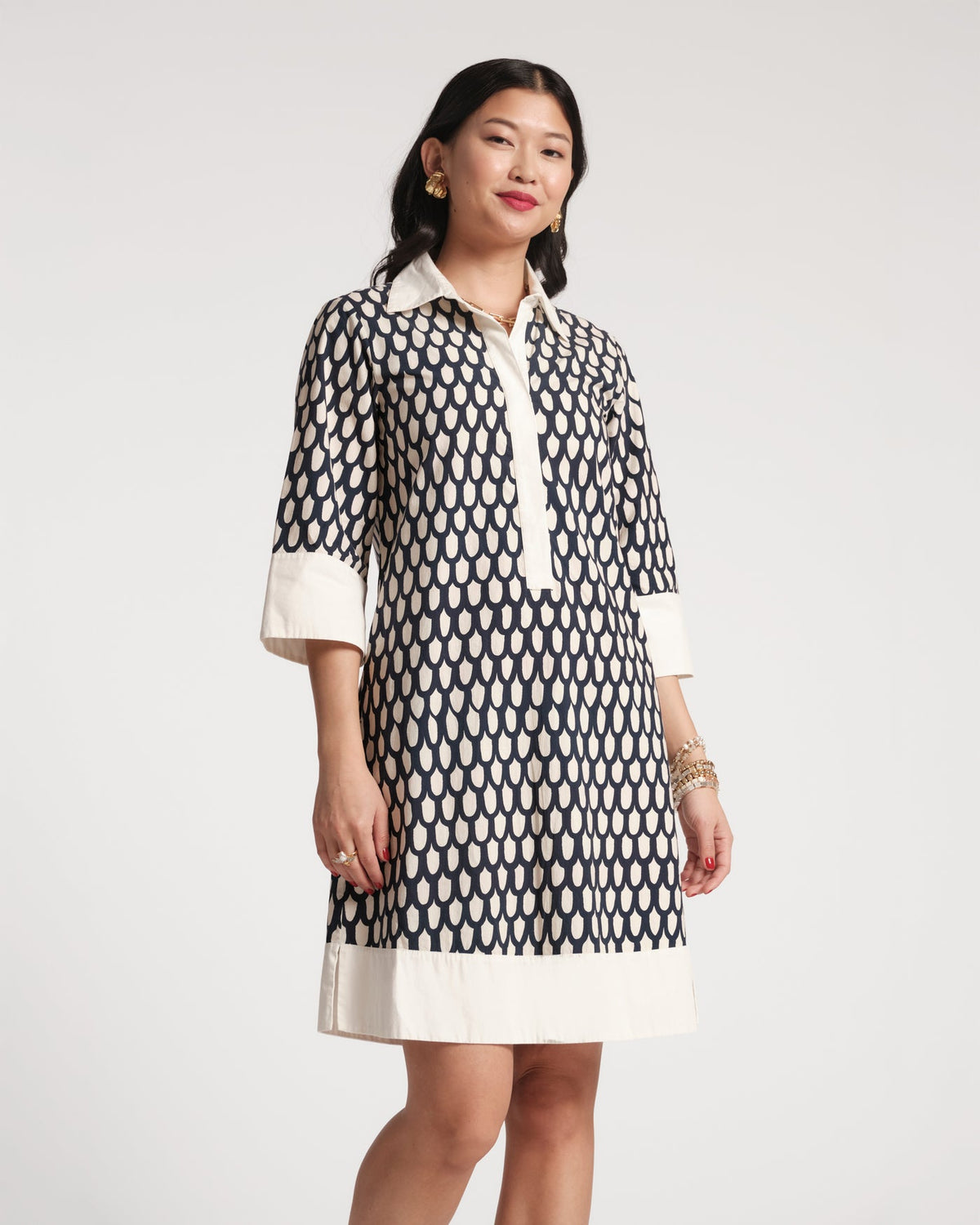 The Tracey Mini Dress is your go-to for everything from brunches to weekend getaways. Designed with a crisp pointed collar, button V-neck, and flowing 3/4-length sleeves finished with crisp white trims along the hem, this straight silhouette is both easy to wear and elevated.