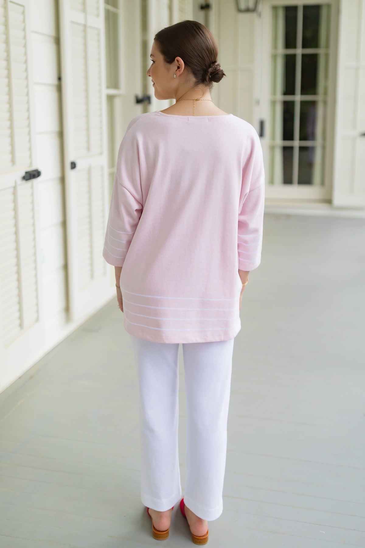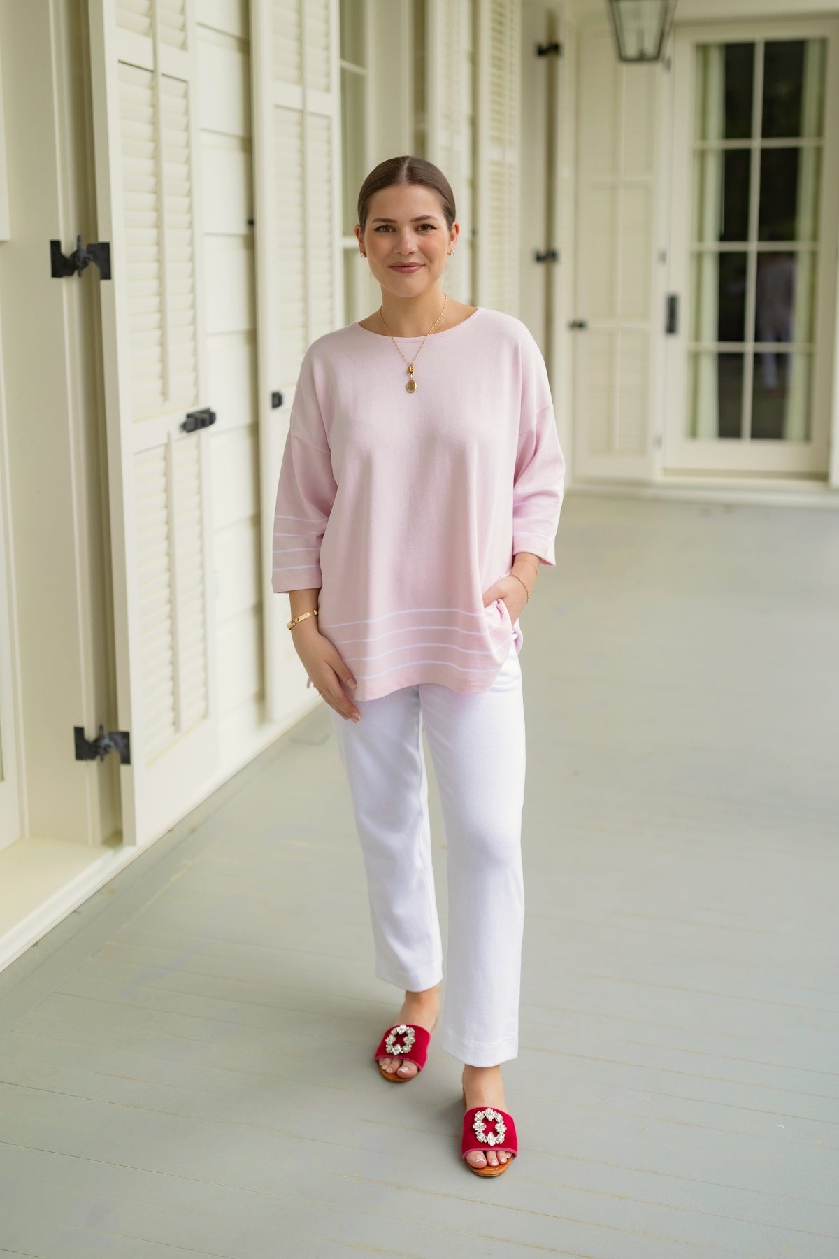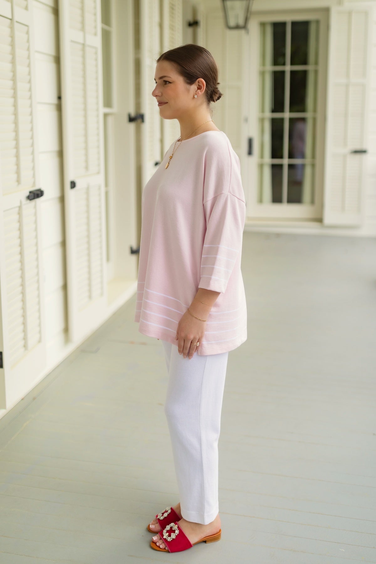 Introducing our 25" Square Striped Hem Top, made from high-quality Peruvian cotton. With 3/4 sleeves, a drop shoulder, and a loose fit, this top offers comfort and style. The crew neck adds a classic touch, making it a versatile addition to your wardrobe.