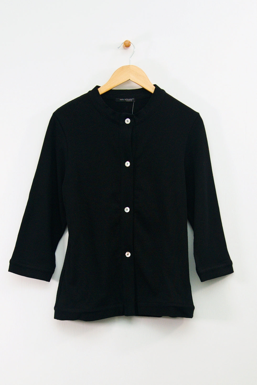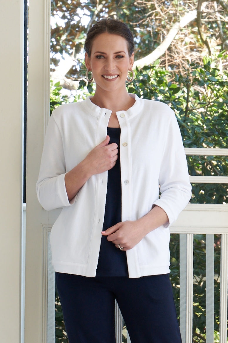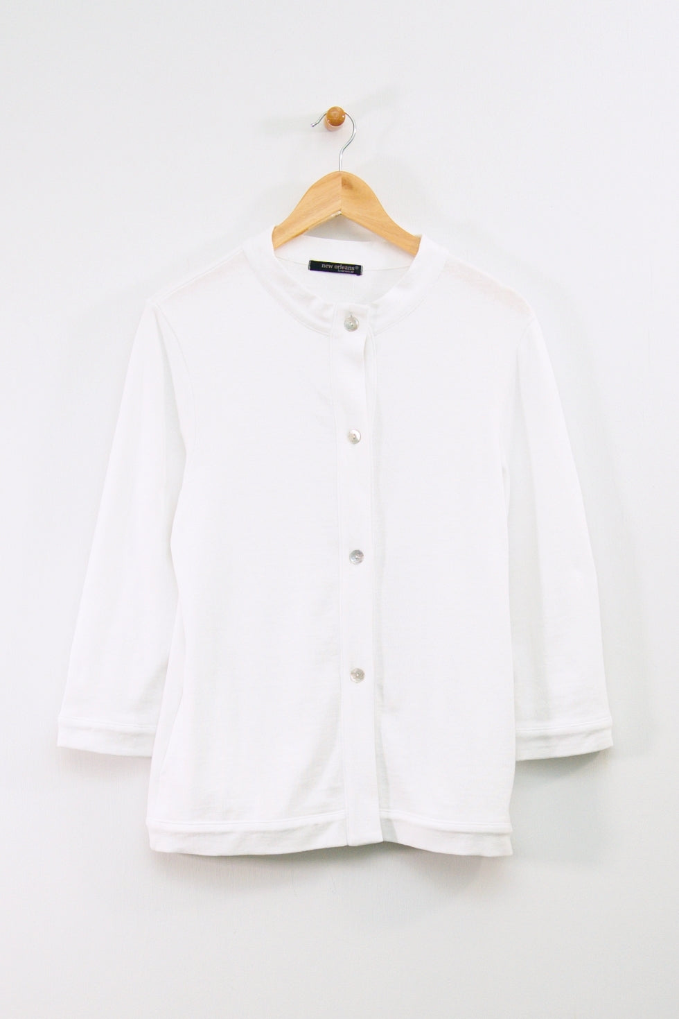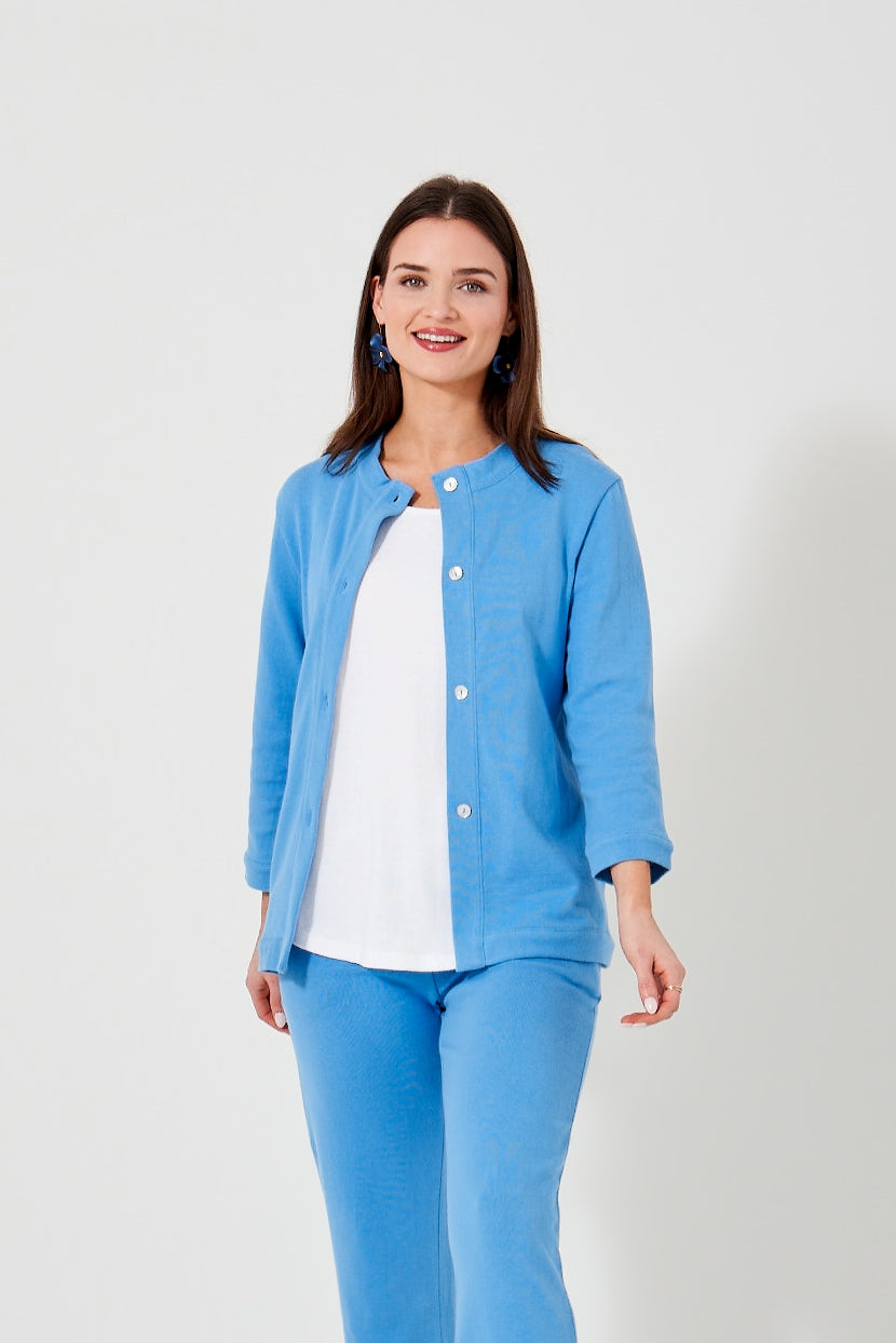 This 26" Cardigan Jacket with Pockets is perfect for everyday wear. Made from soft cotton, it features a classic crew neck and bracelet length sleeves. The shell buttons add a touch of style while the pockets offer convenience. Sustainably made in Peru, it's a must-have for any wardrobe.