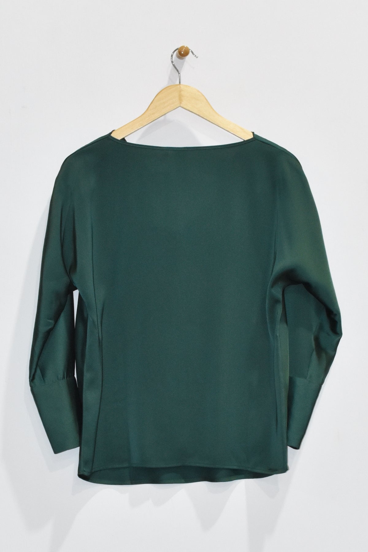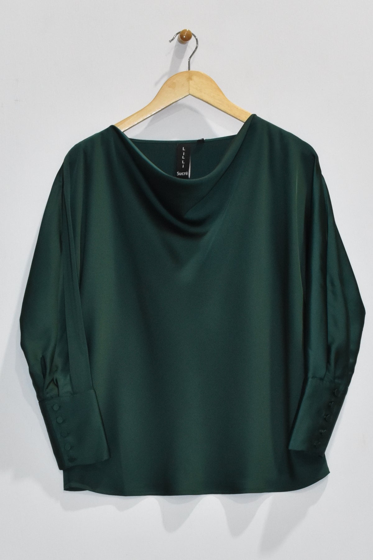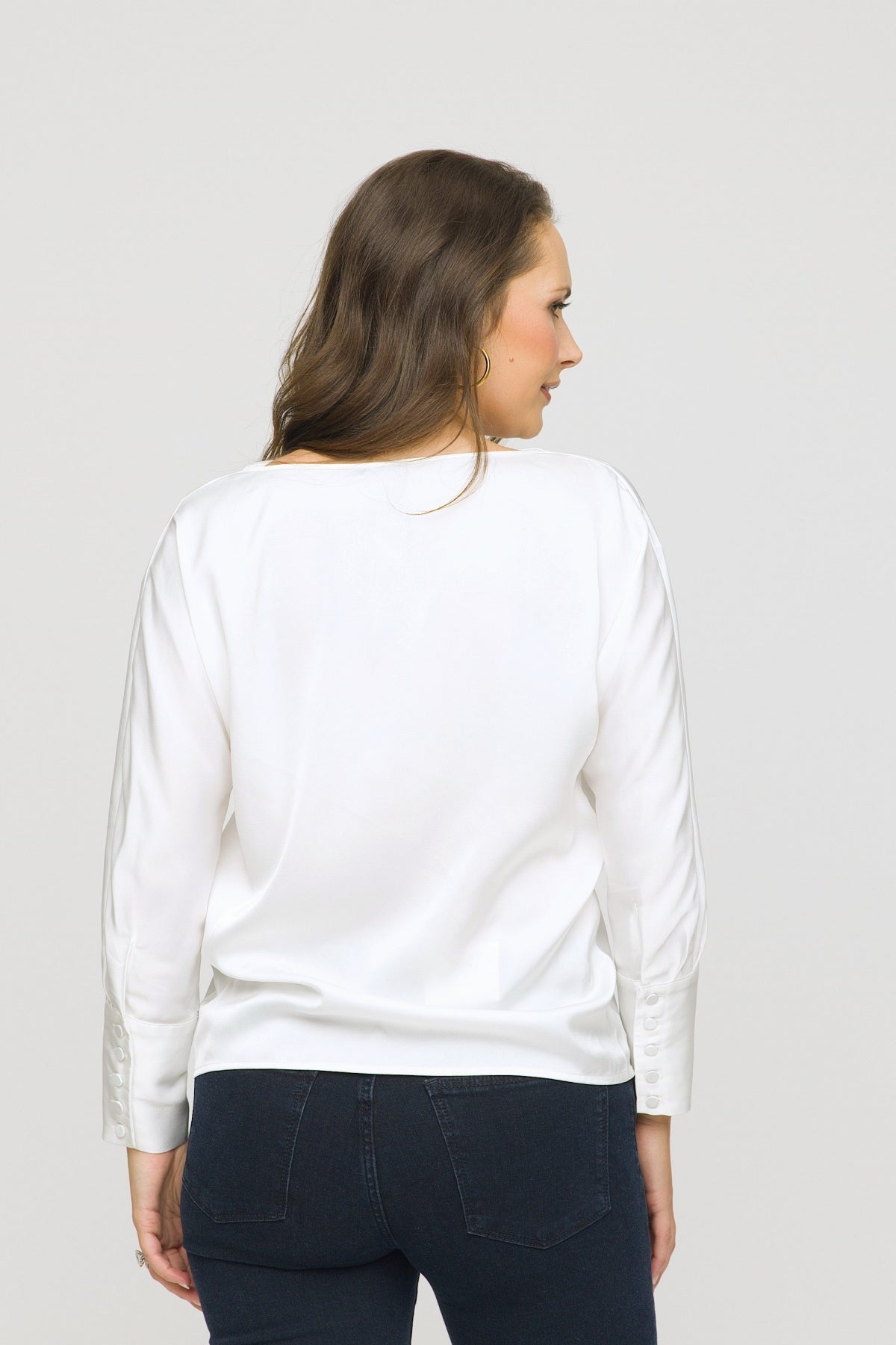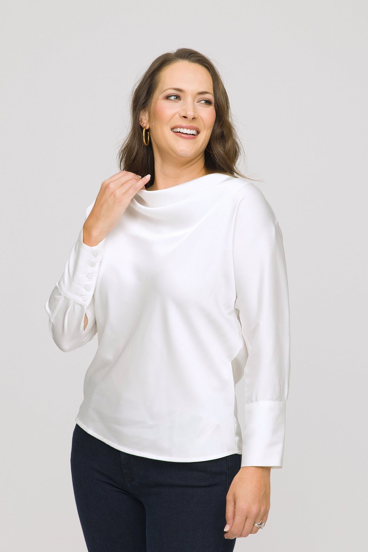 Indulge in luxury with our 26" Draped Collar Dolman Top. Made of sleek satin, this top features button cuffs and a draped collar for an elegant touch. Stay stylish and warm with its long sleeves. Elevate your wardrobe with this timeless piece.