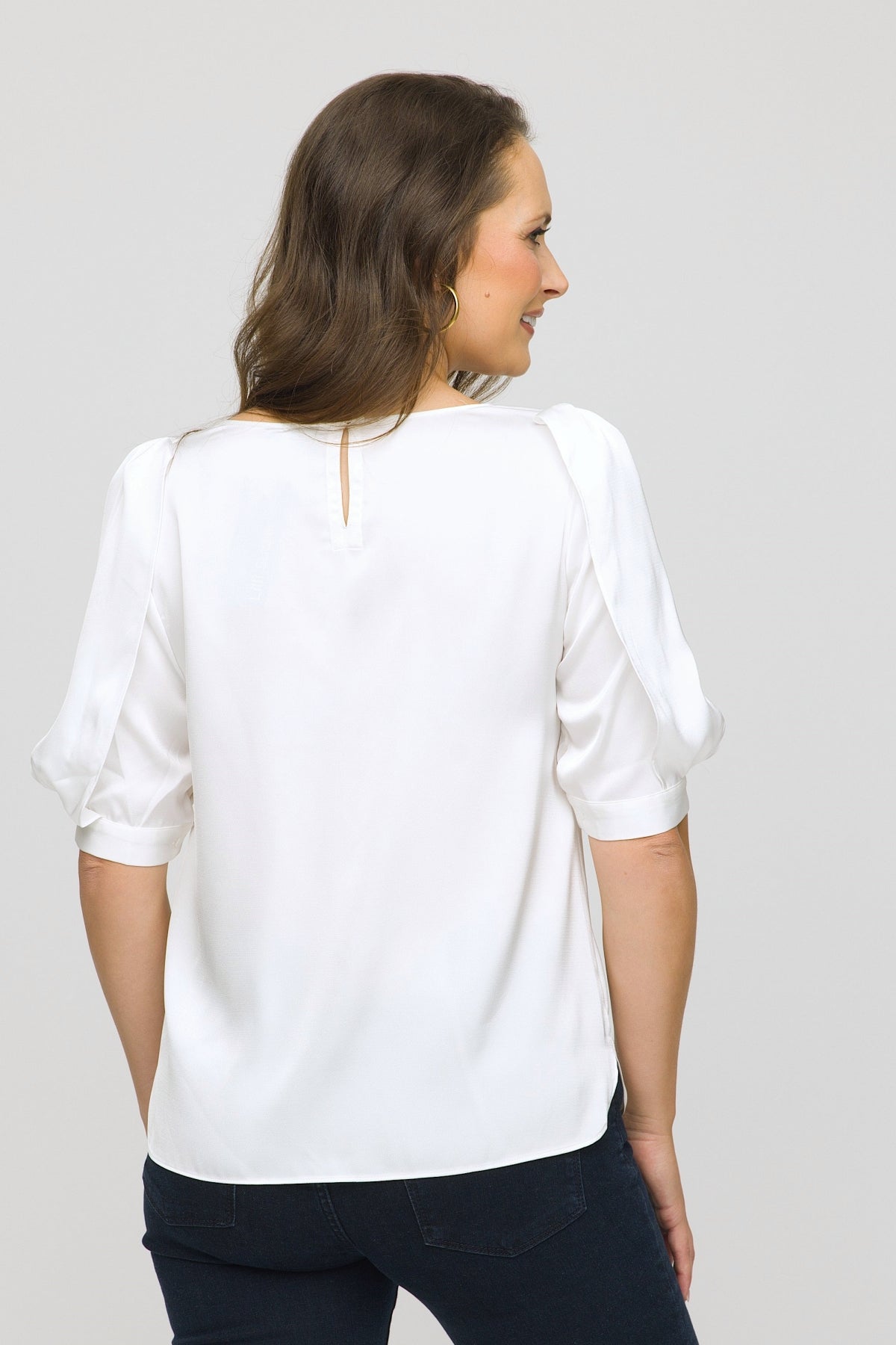 Elevate your style with this 28" Layered Elbow Sleeve Tunic crafted from luxurious stretch satin for a comfortable, flattering fit. The elegant jewel neckline adds a refined touch, while the elbow-length sleeves offer a perfect balance of coverage and breathability. Perfect for both casual outings and dressier occasions, this tunic combines sophistication with effortless wearability.