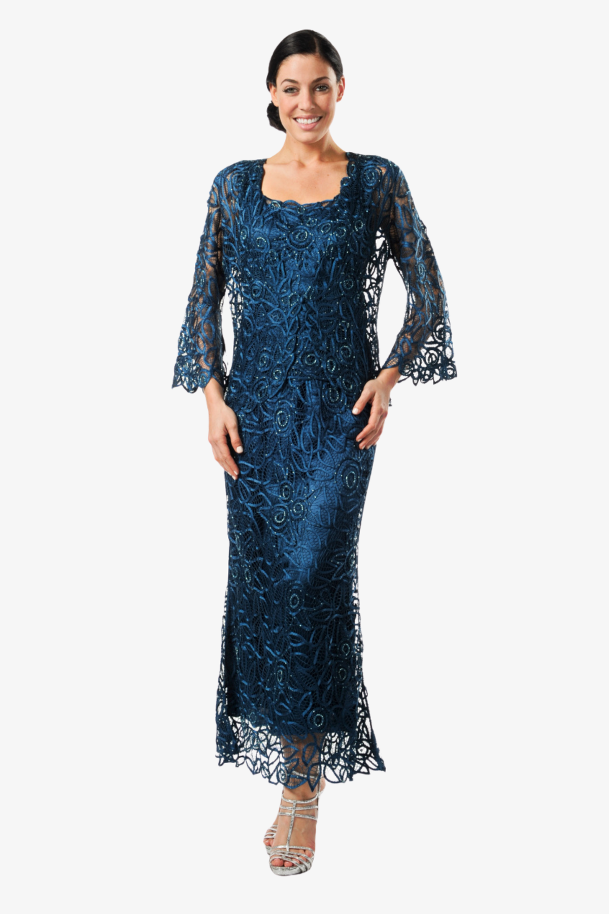 The attention to detail in this three-piece jacket, scoop tank, and long straight skirt is nothing short of extraordinary. The wonderfully intricate Lace of Camellias pattern truly flatters every woman’s figure and makes this piece one of the most popular in the Soulmates’ line. The polished lines evoke a sophisticated silhouette that is truly timeless. Note the intricate openings on the lace flared sleeves as well as the elegantly finish on the draping hem and make this your go-to dress for every formal occasion.