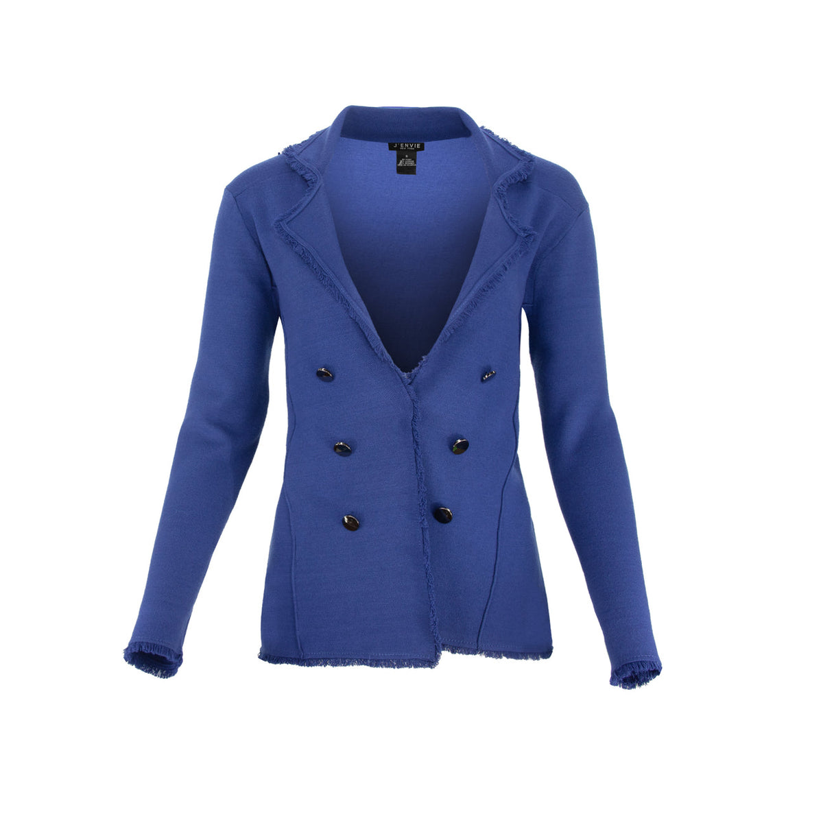 Crafted in their Stolen Softness Proprietary beloved yarn blend, the Mariner's Fringe-Trim Jacket brings a touch of tailored charm to coastal cool. Designed with a double-breasted six-button front, structured collar, and soft fringe trim, it blends polished detail with breezy elegance. Ideal for crisp mornings by the harbor or elevated everyday wear, offered in pastels like Pale Pink and Sky or classics like Black and Ivory. Perfect to pair with denim or trousers. A coastal classic piece.