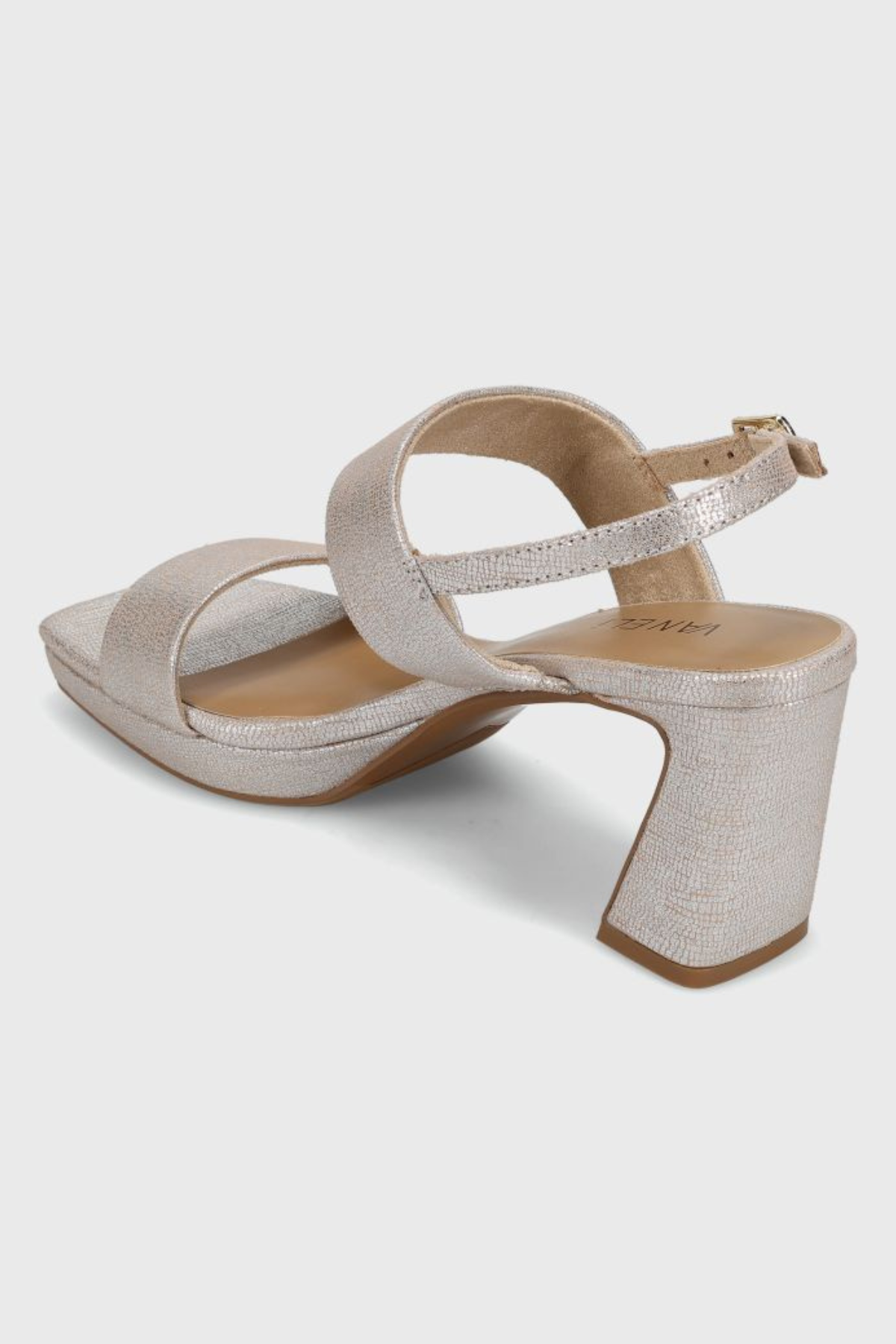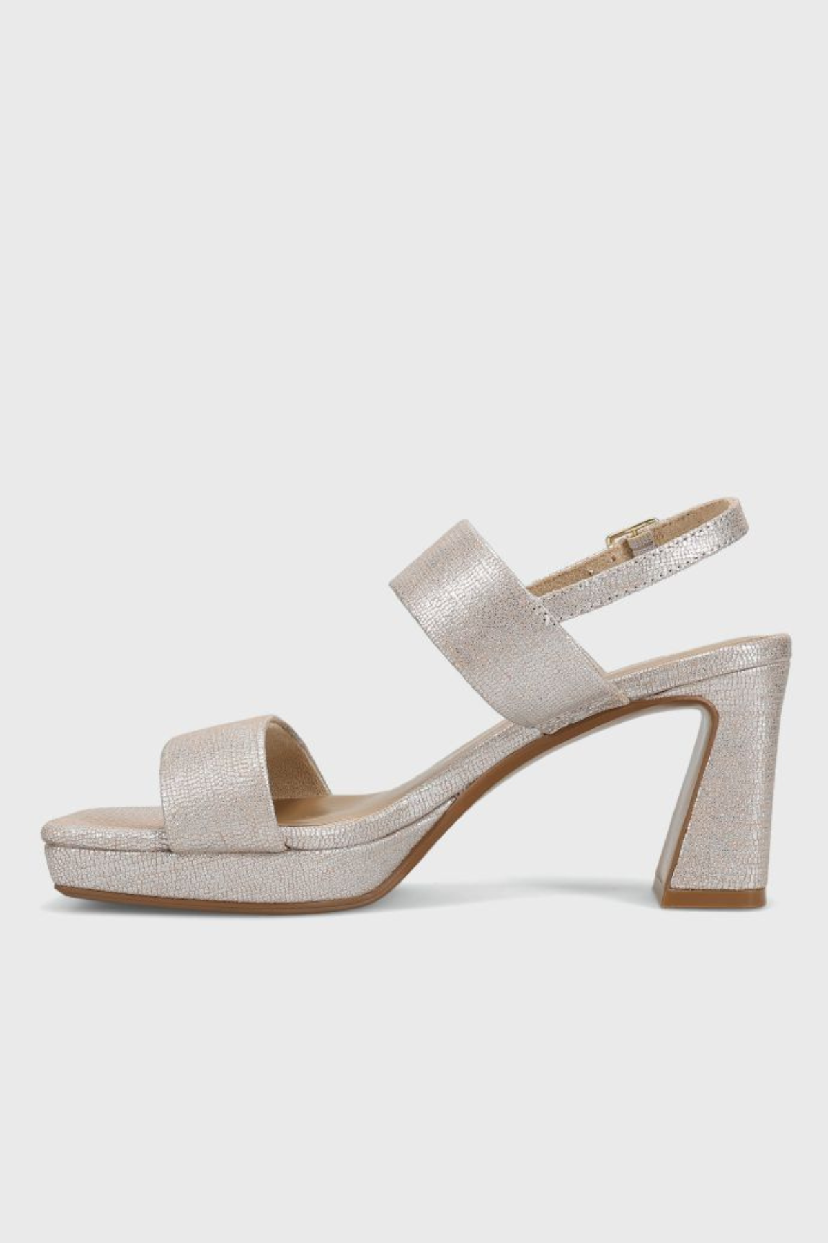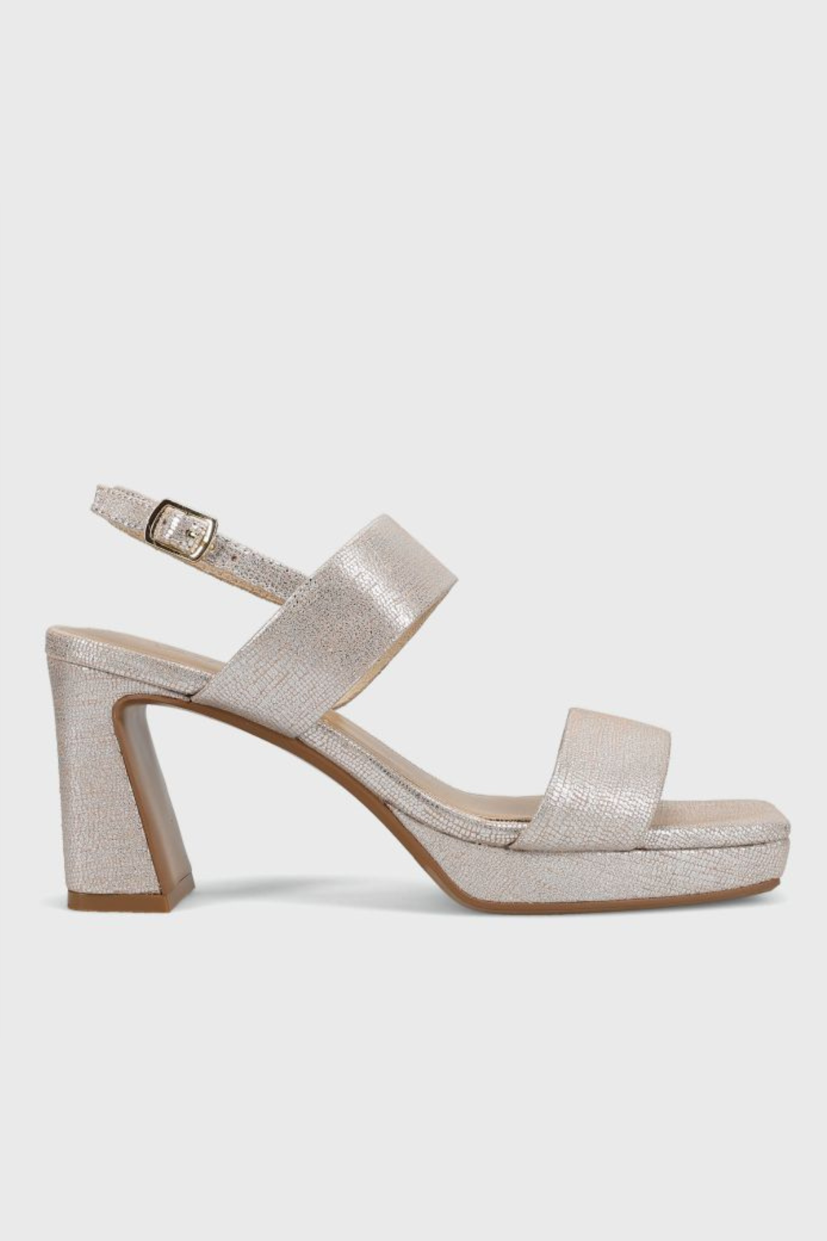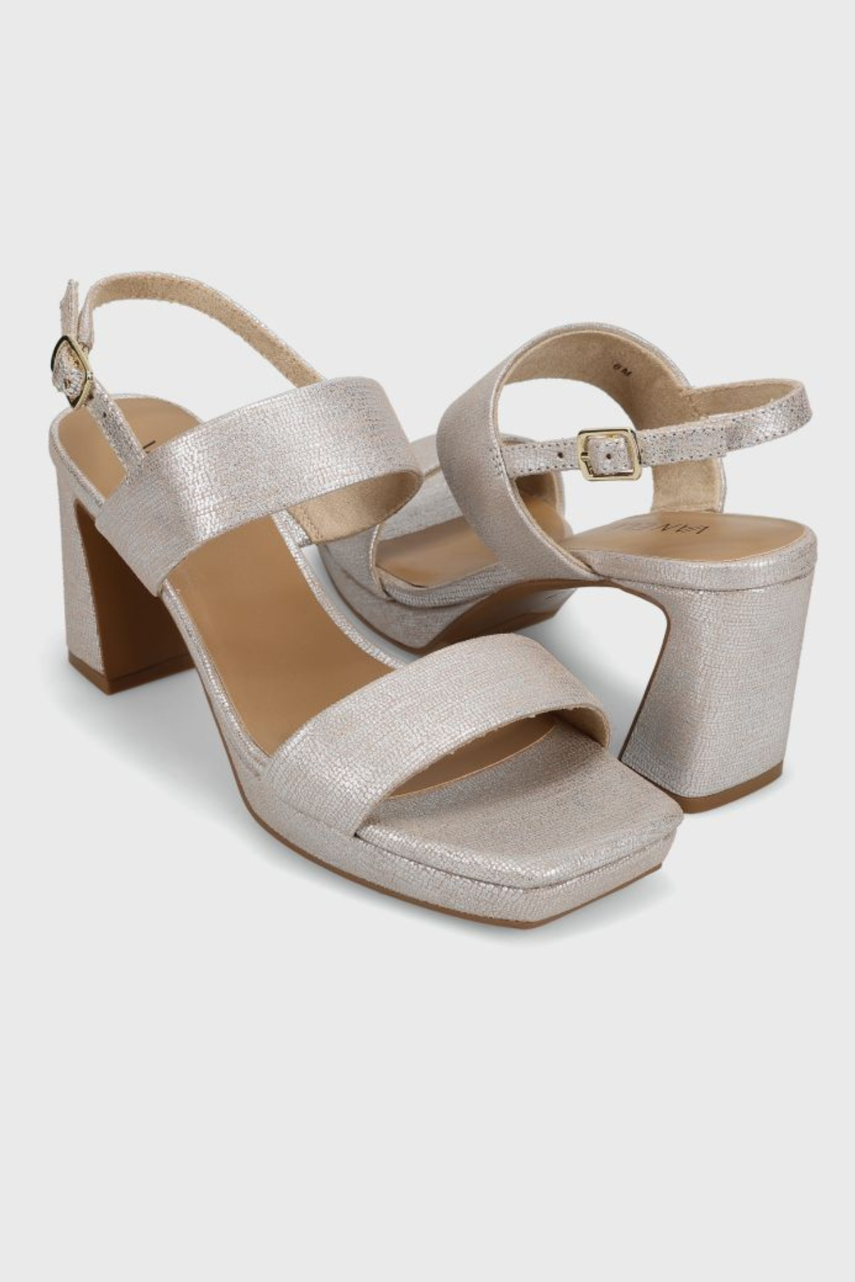High-heel platform sandal. Square toe. Buckle with hidden elastic insert. Padded insole. .75 inch covered front platform. 3 inch covered sculpted heel.