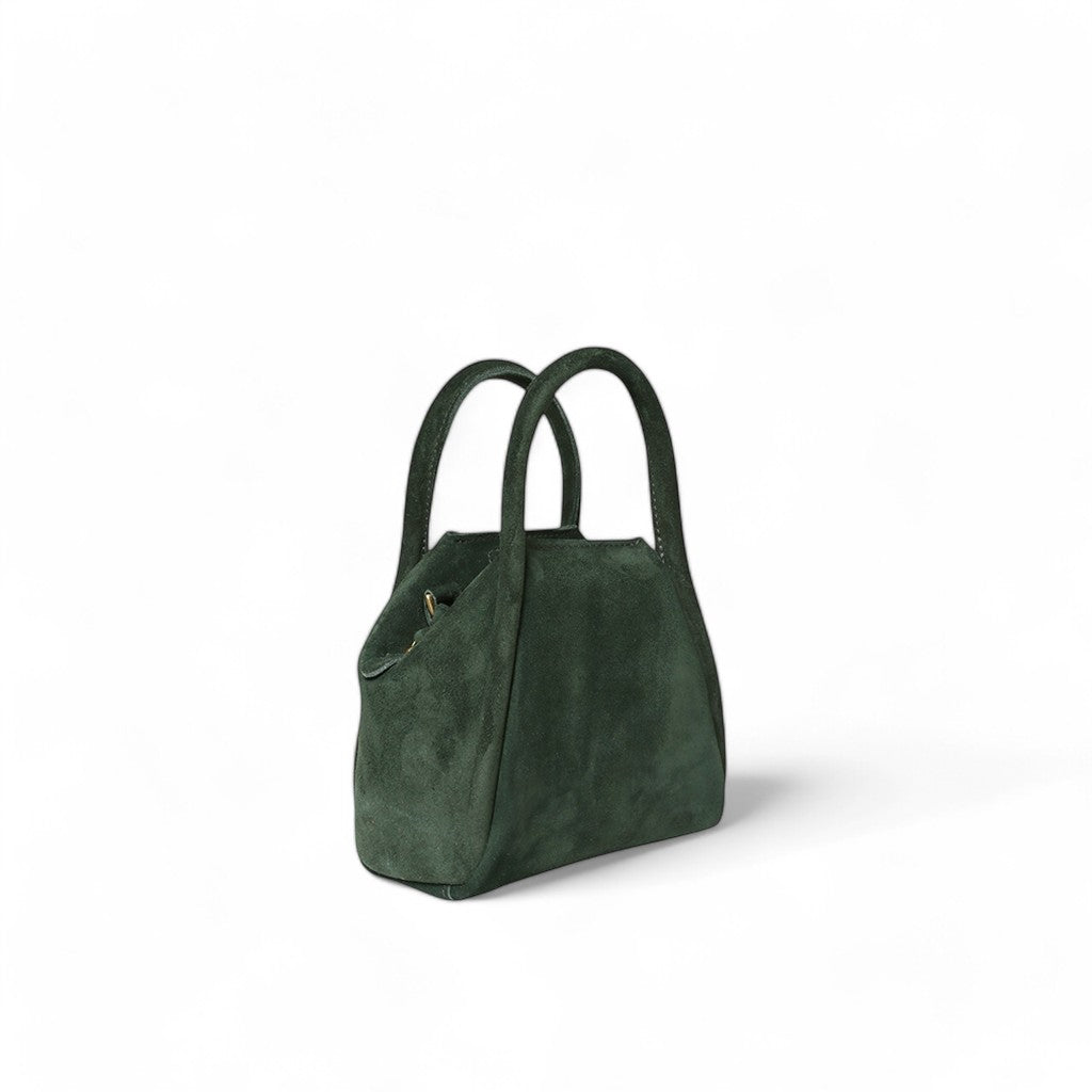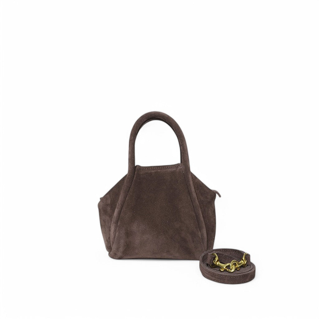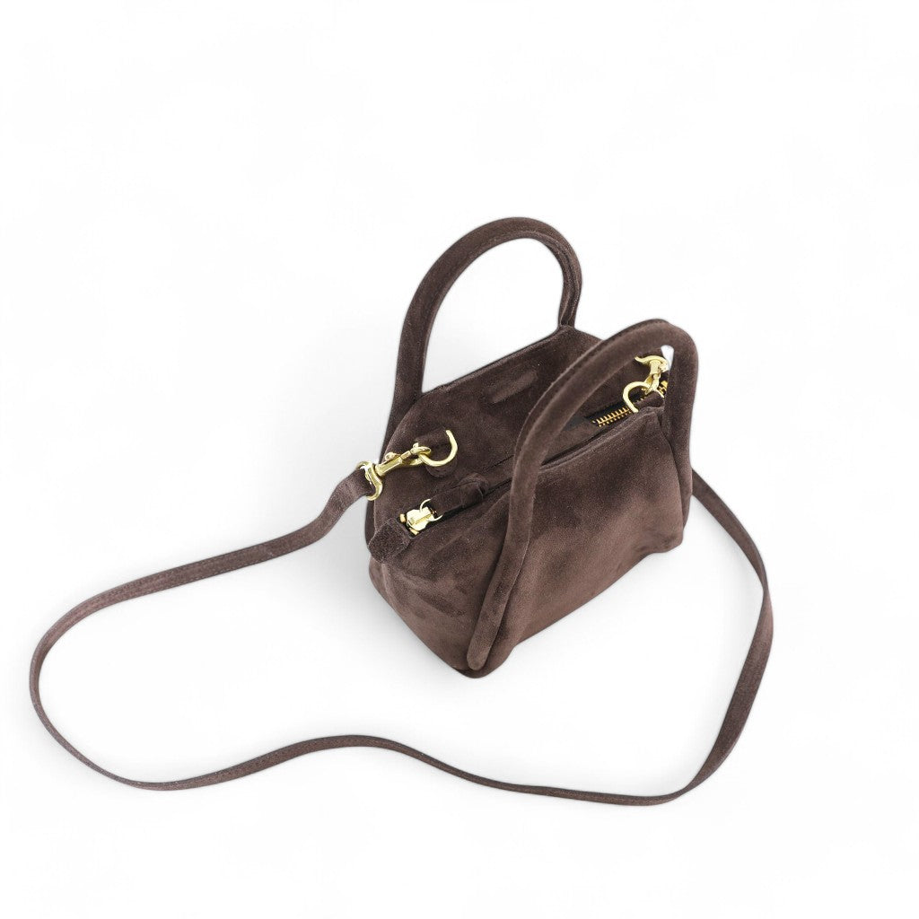 The Mini Taya Handbag is crafted from custom Italian leather-backed suede, treated for superior color resistance and transfer protection. Featuring a 3" top handle drop and an invisible magnetic snap paired with a top zipper, it balances security with sleek design. The unlined interior offers an open pocket for essentials, while the detachable crossbody strap adds versatile wear options. Accented with solid brass hardware, this bag embodies refined craftsmanship and ethical production, proudly made in the USA. For maintenance, a suede brush is recommended to preserve its luxurious finish.