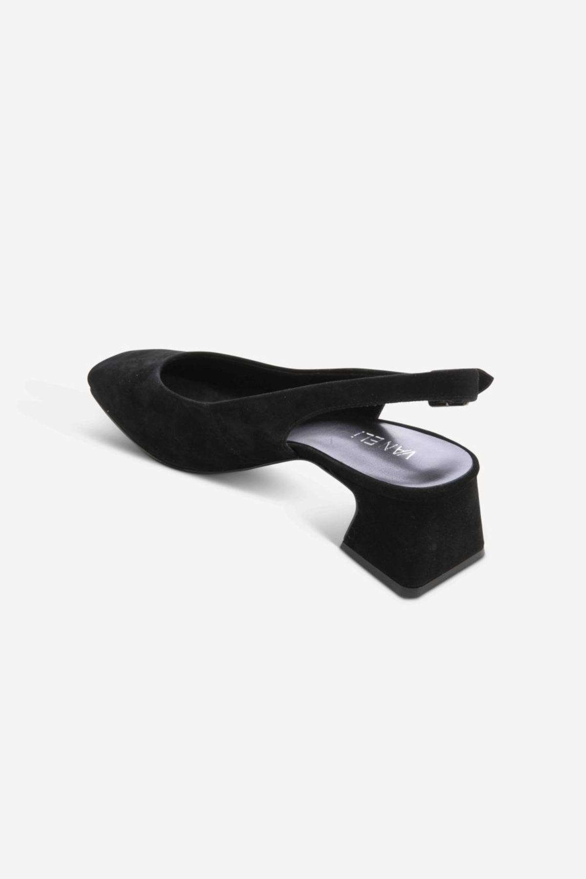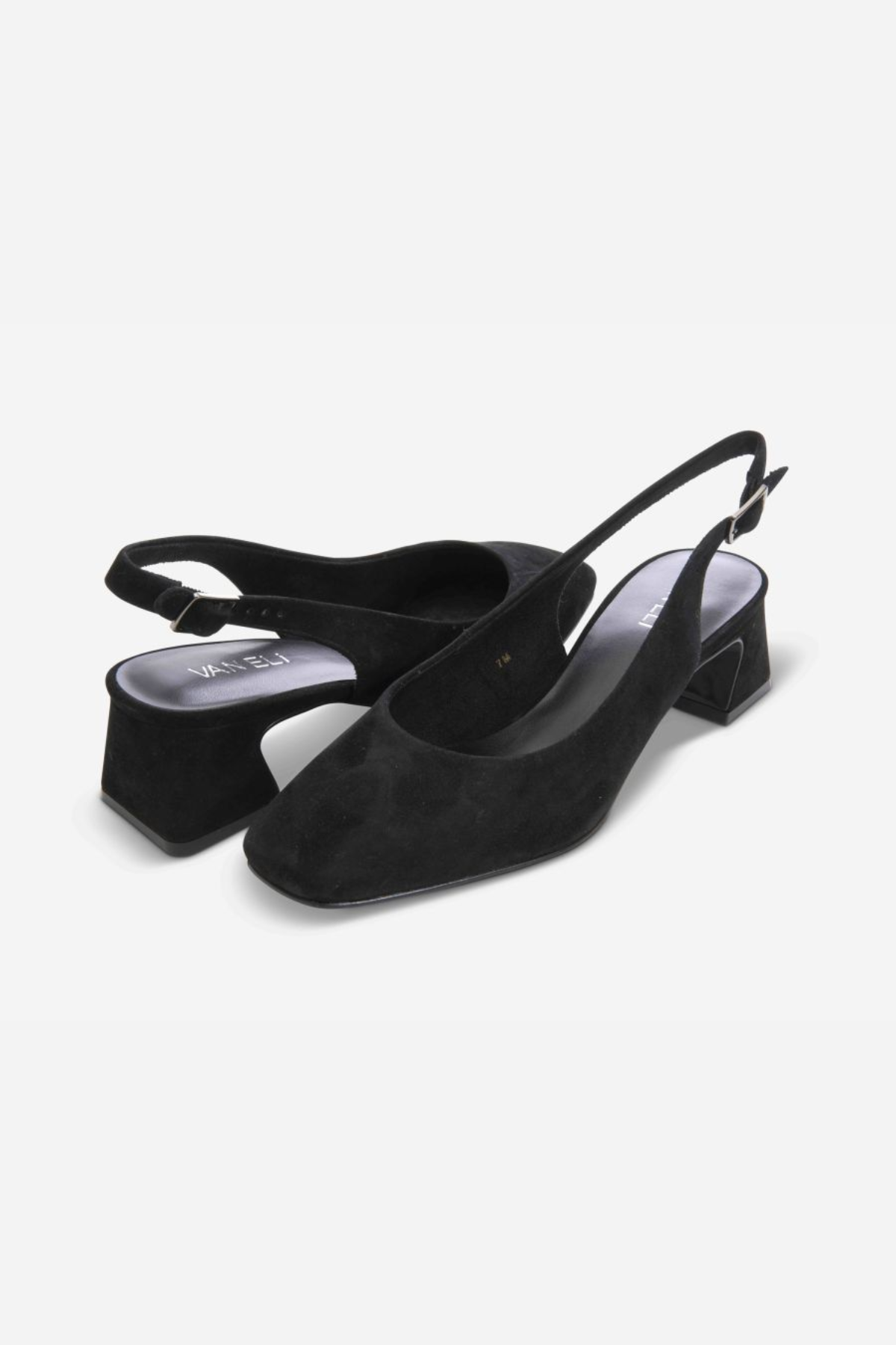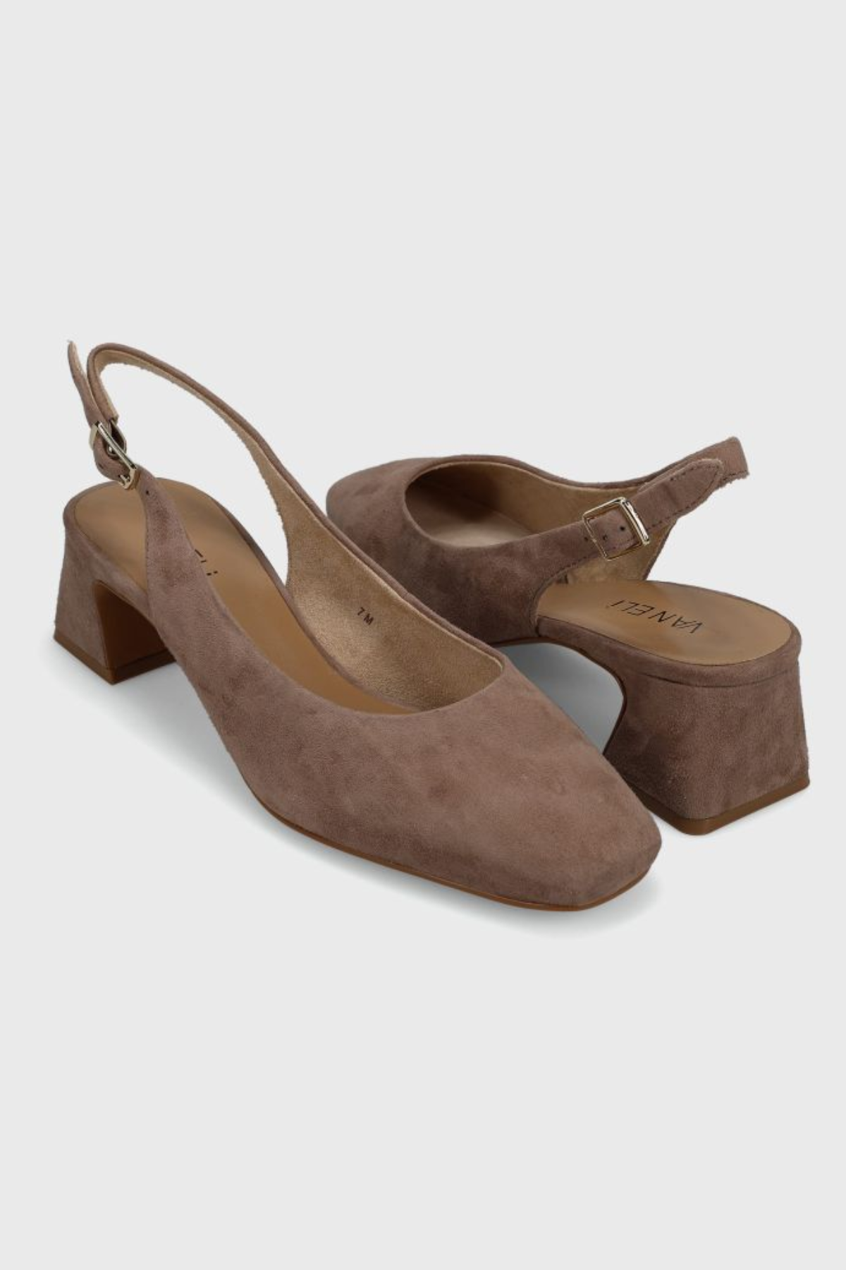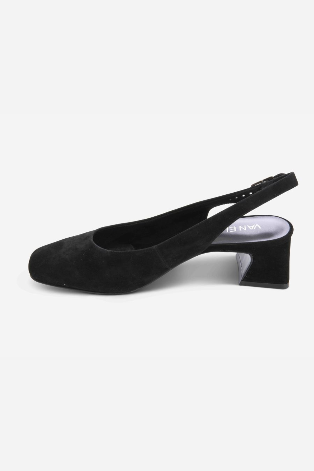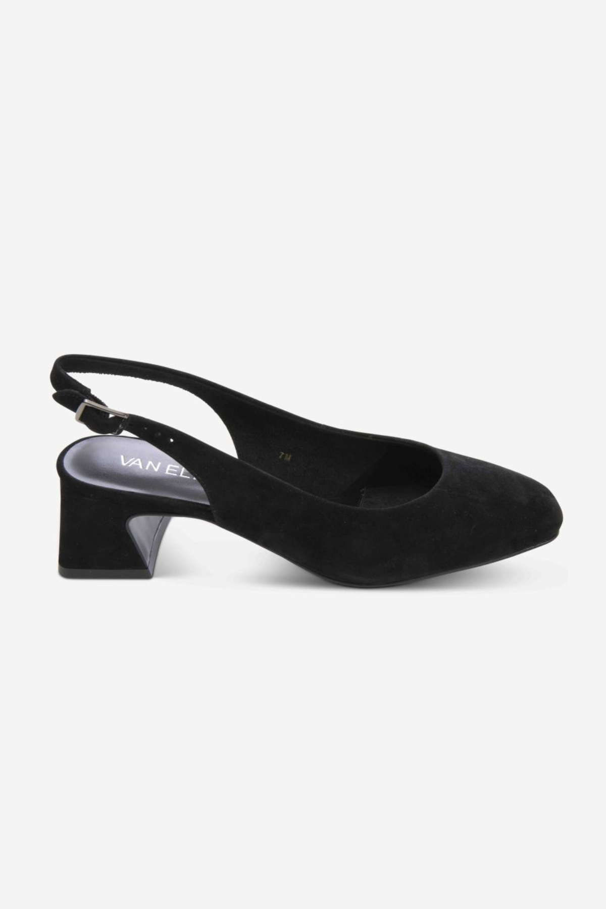 Suede slingback pump. Soft square toe. Adjustable buckle strap with hidden elastic insert. Padded insole. 1.75 inch covered heel.