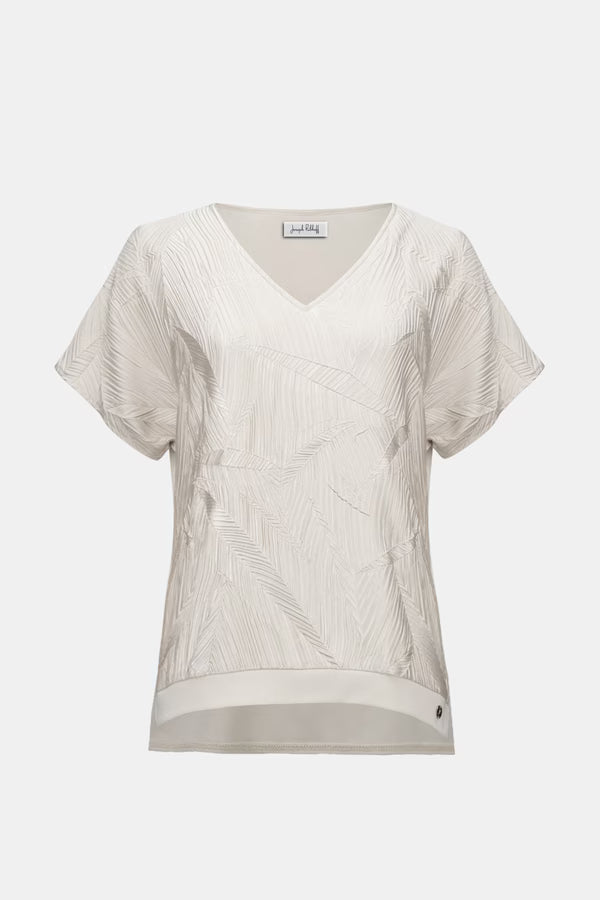 Experience effortless style and comfort with the Joseph Ribkoff pullover. This hip-length, relaxed fit top features a v-neckline and short, straight sleeves, perfect for casual summer outings. The abstract, embroidered, and textured design adds a chic touch to your wardrobe. Ideal for those seeking a blend of casual and chic fashion, this piece seamlessly combines style and versatility.