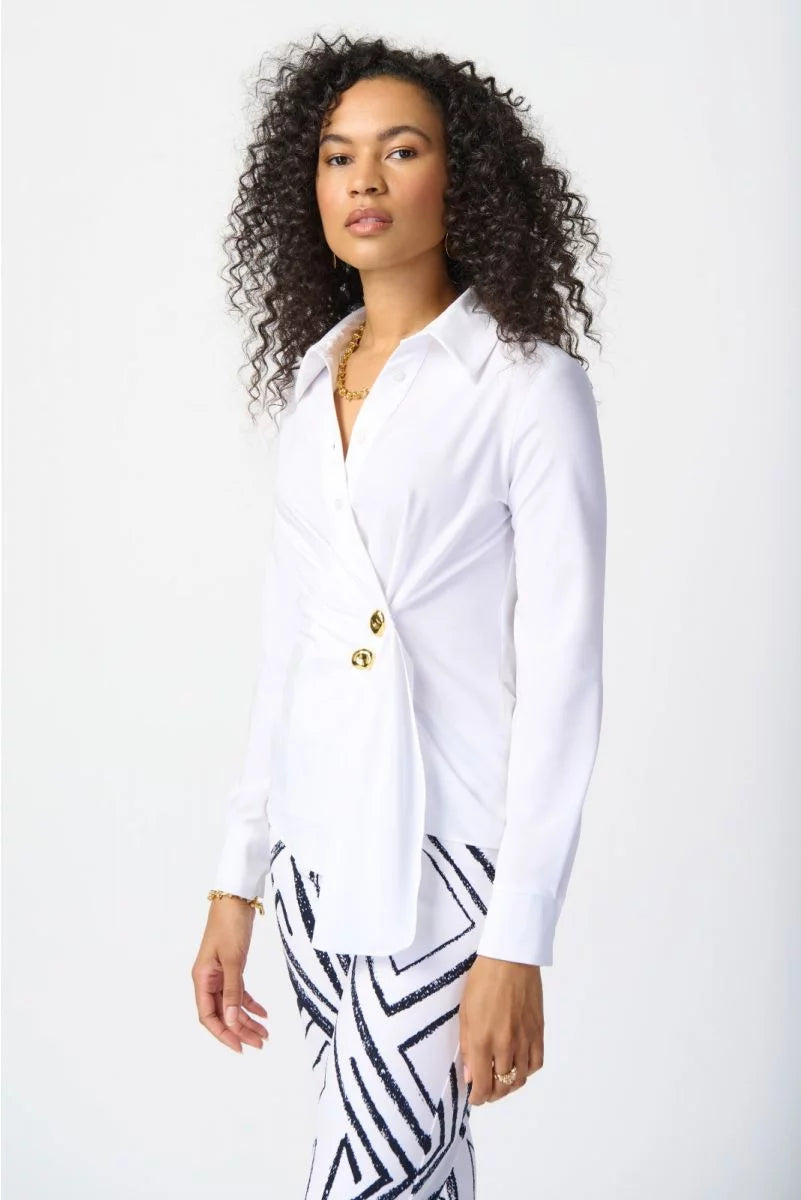 This fit-and-flare blouse boasts a stunning design that mixes shapes to create a unique and elegant look. The luxurious stretch woven fabric enhances the figure-flattering flow of the wrap style, which is completed with an asymmetrical front with gold buttons, long sleeves with cuffs, and an elegant shirt collar.